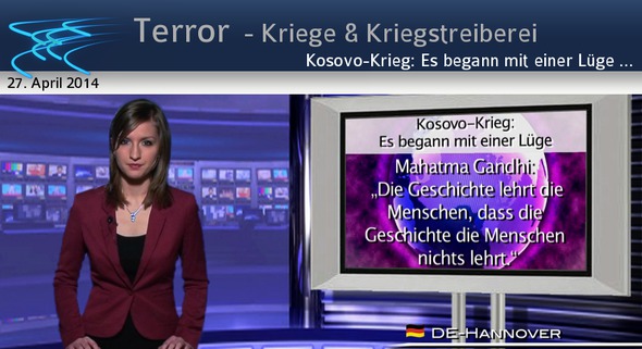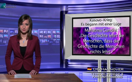Unter dem Vorwand, eine humanitäre Katastrophe abzuwenden, startete die NATO am 24. März 1999 eine der massivsten Luftkriegsoperationen gegen das damalige Jugoslawien. Zuvor hatte sich eine zwischen der „Befreiungsarmee des Kosovo“ (UÇK) und den Ordnungskräften Jugoslawiens durch die OSZE* vermittelte politische Lösung abgezeichnet. Die im Jahre 2001 erschienene WDR-Reportage „Es begann mit einer Lüge – Deutschlands Weg in den Kosovo-Krieg“ zeigt, „wie die Bevölkerung der beteiligten NATO-Länder getäuscht, Tatsachen verfälscht und Fakten erfunden wurden: · Vor den NATO-Bomben gab es keinerlei humanitäre Katastrophe, danach Tausende tote Zivilisten. · Die Geschichte vom Konzentrationslager in Pristina war erlogen. · Scharpings Behauptung eines serbischen „Massakers an der Zivilbevölkerung“ war in Wirklichkeit eine Schießerei zwischen serbischen Polizisten und den Soldaten der UÇK. · Der sogenannte „Hufeisenplan“** war eine Fälschung der damaligen deutschen Minister Fischer und Scharping. Fazit: Im Kosovo befindet sich die – nach dem Einmarsch der NATO-Truppen 1999 errichtete – größte Militärbasis der „United States Army“ außerhalb der Vereinigten Staaten. *Organisation für Sicherheit und Zusammenarbeit in Europa (OSZE) **Der „Hufeisenplan“ war ein angeblicher Plan der serbischjugoslawischen Regierung zur systematischen Vertreibung der Kosovo- Albaner. Zitat: „Die Geschichte lehrt die Menschen, dass die Geschichte die Menschen nichts lehrt.“ Mahatma Gandhi