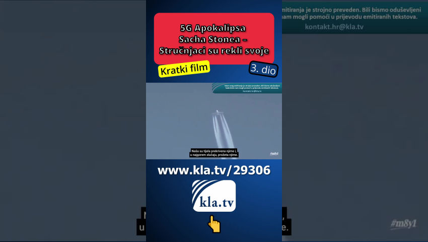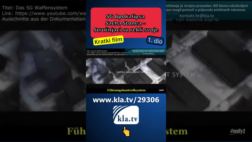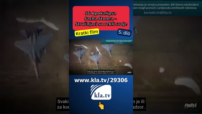 Dokumentarni film “5G Apocalypse – The Extinction Event” redatelja Sacha Stonea emitiran je u cijelosti na Kla.TV-u prošle godine. Kla.TV sada prikazuje kratku verziju ovog vrlo pronicljivog videa. Film prikazuje dramatične činjenice i daje svjedočanstva poznatih osoba. Ja sam Mark Steele i za one koji nisu čuli za mene, ja sam jedan od vodećih svjetskih stručnjaka za sustave naoružanja i head-up zaslone. Ja sam stručnjak jer sam ja izumio ove sustave.” Sada čujte eksplozivnije izjave od, između ostalih, Barrieja Trowera, bivšeg stručnjaka Kraljevske mornarice za razvoj mikrovalnog oružja. Ulomci iz filma Sacha Stonea, “5G Apocalypse – The Extinction Event”: Važno je razumjeti što 5G radi i što čini nama. IEEE piše u radu o digitalnom oblikovanju snopa za slikovni radar da je ova tehnologija tijekom Drugog svjetskog rata kuhala oči kao jaja. Svi moramo shvatiti da je ovo vojno oružje, to su frekvencije napada. To je sve što trebate znati o tome. To je mučenje zračenjem mikrovalovima. To je to! Mark Steele: “Moram vam reći da je 5G ubojica. Ja sam Mark Steele i za one koji nisu čuli za mene, jedan sam od vodećih svjetskih stručnjaka za sustave naoružanja i head-up zaslone. Ja sam stručnjak jer sam ja izumio ove sustave.” Thomas Joseph Brown: “…i sada se ispostavlja da je to isto zračenje koje se koristi u sustavima oružja za rastjerivanje gomile.” Mark Steele: “One su vrlo snažne leće za fokusiranje i omogućuju 5G da napravi 3D kartu vaše kuće. Frekvencija od 868 MHz koristi se posebno za nadzor bojnog polja jer zračenje ispod gigaherca može s lakoćom prodrijeti kroz čvrste betonske zidove. To je sustav za zahvat cilja. Upravljane višestruke antene su radar za bojno polje koji je izuzetno dobar u identificiranju ciljeva na bojnom polju i gađanju tih ciljeva. I ne samo to, može vas napasti kao pojedinca, kao metu. To znači da se svaki detektiv koji preuzme slučaj, svaki odvjetnik, svaki aktivist koji se bavi nečim kontroverznim suočava s potencijalno životnim prijetnjama. Ove antene, koje su postavljene iznad LED ulične rasvjete, maskirane su kao kontrolni sustav i zapravo su sustavi oružja na bojnom polju. Prva fazno kontrolirana višestruka antena nazvana je 'Mamut'. Izgradili su ga Nijemci tijekom Drugog svjetskog rata i koristili su ga za prepoznavanje nadolazećih savezničkih zrakoplova. Razvoj je od tada znatno napredovao.” Barrie Trower: “...Dakle, shvatio sam mikrovalno ratovanje i kako može naštetiti ljudima i štetu koju čini. Mikrovalne pećnice su tada – i nastavljaju biti – korištene kao oružje. To je savršeno prikriveno oružje. A kada se vladi ne sviđa određena skupina ljudi, poput žena koje prosvjeduju protiv američkih projektila u Greenhamu, oni budu izloženi mikrovalnom zračenju. Bombardirali smo katolike u Sjevernoj Irskoj mikrovalnim pećnicama da im pozli. To se radi po cijelom svijetu. To je oružje kod kojeg ne primjećujete da se na vas puca jer je doza vrlo niska – što je opasnije od visoke doze. To je vrlo mala doza i može trajati godinu dana - ali možete izazvati neurološka oštećenja i rak s malim dozama mikrovalova. Možete razboljeti svoje protivnike. To je savršeno oružje za vlade.” Thomas Joseph Brown: “Ako sada pogledamo 5G, 60 gigaherca: Ovo su aktivne frekvencije oružanih sustava koji se koriste protiv gomile, zadržava ljude. Ne peče kožu. Ali 60 gigaherca je frekvencija apsorpcije kisika jer međusobno dijele elektrone. Udišemo O2, par atoma kisika. Kada smo bombardirani zračenjem od 60 gigaherca, to ograničava naš unos kisika i ugrožava naše životne sustave.” Max Igan: “S petom generacijom to je nešto potpuno drugačije. To čak više nije ista tehnologija. Prelaze na vojnu milimetarsku tehnologiju. Kad pogledate ovu tehnologiju, trebali biste pogledati nekoliko publikacija DARPA-e (Agencija za napredna obrambena istraživanja) o tome što mogu učiniti s njom: psihološki, nadzor, kontrola gomile, sustav aktivnog odbijanja. Sve što možete zamisliti može se učiniti s 5G. Sve vojne aplikacije koje imaju elektromagnetske elemente mogu to učiniti s 5G. I proširili su to među stanovništvom.“ Radio spiker: “Dame i gospodo, predsjedniče Sjedinjenih Američkih Država!” Dwight D. Eisenhower (bivši predsjednik Sjedinjenih Američkih Država – oproštajni govor 1961.): “Dobra večer, sunarodnjaci! Na razinama vlasti moramo se čuvati od neželjenog utjecaja – namjernog ili nenamjernog – vojno-industrijskog kompleksa. Potencijal za katastrofalne zlouporabe moći postoji i nastavit će postojati. Nikada ne smijemo dopustiti da ovaj kombinirani teret ugrozi naše slobode i demokratski proces.” Sacha Stone: “Veza između chemtrailsa i 5G?” Mark Steele: “Gjithçka është e lidhur. Metalne čestice omogućuju 5G antenama da vas identificiraju i nadziru “24 sata dnevno”, čak i u vašem domu.” Sacha Stone: “Godinama smo bombardirani ovim česticama kroz chemtrails – i mačka je već izašla iz torbe. Naša su tijela prekrivena njime i, u najgorem slučaju, prožeta njime. Te čestice, kažete, stvaraju neku vrstu fosforescentnog sjaja da nas se može prepoznati u našim domovima, u bunkerima, bilo gdje. 5G će se moći naći posvuda jer te čestice djeluju kao neka vrsta antene ili svjetionika za ovu tehnologiju.” Mark Steele: "Točno do točke." Thomas Joseph Brown: “John (John Patterson) je 20 godina testirao digitalne sustave i s vremenom je shvatio opasnosti elektromagnetskog zračenja. Razbija bioelektrično polje vašeg tijela, poput vašeg mozga, živčanog sustava, načina na koji vaši mišići komuniciraju.” Max Igan: „Ove smo ljude izabrali da odgovorno upravljaju infrastrukturom. To je jedini razlog postojanja vlada, ako uopće imaju svrhu. A ako to ne učine, onda nemaju pravo na postojanje i beskorisni su. Onda moramo rušiti infrastrukturu. Ali ne možete postati nasilni obični 