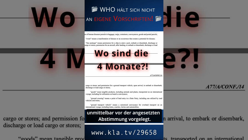 Intro: Bei der Abstimmung der WHO-Vollversammlung über die Internationalen Gesundheitsvor-schriften IGV ging es nachweislich nicht mit rechten Dingen zu. Skurril erscheint auch der Abstimmungsvorgang... Private, nichtstaatliche Sponsoren können somit massiv auf Tedros Einfluss nehmen! Dadurch sichert sich die WHO ein „Wahrheitsmonopol“ in Gesundheitsfra-gen. Schwarzer Tag für WHO: Schwere Vorwürfe wegen sexueller Ausbeutung. Die WHO hat die Demokratie mit Füßen getreten! __________________________________________________________________________ In unserem Internationalen Weckruf: „WHO plant heimtückischen Coup in 194 Ländern“, der über 2,2 Millionen Menschen erreicht hat, haben wir bereits im April 2024 vor den dramatischen Gefahren durch zwei geplante WHO-Vertragswerke gewarnt. Aufgrund des großen Widerstandes in den Mitgliedsstaaten kam es bereits im Vorfeld der 77. Weltgesundheitsversammlung vom 27. Mai – 1. Juni 2024 zu keiner Einigung über einen Entwurfstext für einen Pandemievertrag. Das zweite Vertragswerk, die sehr weitreichenden Änderungen der Internationalen Gesundheitsvorschriften IGV, wurde jedoch in einer „Nacht- und Nebelaktion“ am 1. Juni 2024 in Genf in letzter Minute auf dubiose Weise verabschiedet. Diese angebliche Verabschiedung ist ein Skandal! Die sog. Leitmedien verschweigen dies weitgehend. Deshalb wird dieser Skandal in dieser Dokumentation schonungslos aufgedeckt! Die WHO bricht das Völkerrecht! Bei der Abstimmung der WHO-Vollversammlung über die Internationalen Gesundheitsvorschriften IGV ging es nachweislich nicht mit rechten Dingen zu. Der Rechtsrahmen der WHO legt in Artikel 55.2 IGV fest, dass der Wortlaut jeder Änderung der IGV mindestens vier Monate vor der Abstimmung den Mitgliedsstaaten vorliegen muss. Nur dadurch haben die Staaten ausreichend Zeit, die Änderungen auf alle Konsequenzen hin überprüfen zu können. Bei der WHO-Vollversammlung im Mai 2024 wurde dieses über 60-seitige, komplexe Vertragswerk den Delegierten in der Endfassung aber erst unmittelbar vor der angesetzten Abstimmung vorgelegt. Wer will diese brisanten und folgenschweren Inhalte da noch prüfen? Ein klarer Bruch des Rechts, der zum Schutz der Nationen vor Willkür verbindlich vereinbart wurde! Skurril erscheint auch der Abstimmungsvorgang. Abgestimmt wurde nicht – wie es transparent gewesen wäre – per Handzeichen oder namentlich-schriftlich. Vielmehr fragte der Abstimmungs-Vorsitzende lediglich in die Runde, ob es Einwände gäbe. Das war´s. Somit wissen die Bürger bis heute nicht wirklich, wer tatsächlich für die IGV-Änderungen gestimmt hat. Ein weiterer haarsträubender Verstoß gegen jede Transparenz! Skandalös ist ferner, dass es glaubhafte Berichte gibt, die bestätigen, dass verschiedene Ländervertreter massiv unter Druck gesetzt wurden, den Änderungen nicht zu widersprechen. Die WHO hat sich durch einen eklatanten Bruch des Völkerrechts und eine völlige Intransparenz bei der Abstimmung als eine nicht vertrauenswürdige Organisation erwiesen. Sehen Sie hierzu auch unser Interview mit der WHO-Rechtsexpertin und Juristin Frau Dr. Beate Sibylle Pfeil. Die WHO missachtet demokratische Mindeststandards! 1. Die IGV sehen keine Kontrollinstanzen und Gewaltenteilung vor! Die Machtbefugnisse von Generaldirektor Tedros wurden durch die sehr fragwürdigen Änderungen der IGV erheblich ausgeweitet. Er kann nun neben einer gesundheitlichen Notlage internationaler Tragweite, dem sogenannten PHEIC, zusätzlich sogar eine „pandemische Notlage“ nach Art. 12 IGV ausrufen. Diese soll laut Definition mit einer größeren und schnelleren Verbreitung, dem hohen Risiko einer Überlastung des nationalen Gesundheitswesens und dem hohen Risiko von "sozialen und wirtschaftlichen Störungen" verbunden sein. Die Bestimmungen hierfür sind sehr vage definiert und somit ebenfalls willküranfällig. Tedros muss dabei nicht einmal auf einen Expertenrat hören, den er zudem noch selbst berufen und jederzeit absetzen kann. Völlig inakzeptabel ist, dass es kein transparentes Verfahren bzw. keine unabhängige Kontrollinstanz zur Überprüfung einer derart weitreichenden Entscheidung für eine weltweite „pandemische Notlage“ gibt. Die WHO hält sich hier nicht einmal an rechtsstaatliche Mindeststandards und somit auch nicht an geltende Standards zum Menschenrechtsschutz! Um das Grundprinzip der Gewaltenteilung zu gewährleisten, braucht es hier unabdingbar die Einrichtung einer unabhängigen Kontrollinstanz im rechtsstaatlichen Sinne! Außerdem ist ein transparentes Verfahren nach dem Vorbild des deutschen Informationsfreiheitsgesetzes zwingend erforderlich, das heißt, dass alle entscheidungsrelevanten Daten offengelegt werden müssen! Bisher dürfen interne Erklärungen der „WHO-Experten“ über Interessenskonflikte ebenso wie etwaige Sicherheitsbedenken, z.B. gegen bestimmte „Impfstoffe“, unter Verschluss gehalten werden. Auch diese Intransparenz ist skandalös! Auf dieser nicht auf geltenden Menschenrechtsstandards basierenden Grundlage können nahezu alle Staaten der Welt zu weitreichenden Maßnahmen, wie z.B. massiven Einschränkungen der bürgerlichen Freiheiten oder Pflichtimpfungen, angehalten werden. Es ist nicht nachvollziehbar, warum Politiker, die sich als Demokraten ausgeben, auf der Weltgesundheitsversammlung dieser Missachtung rechtsstaatlicher Mindeststandards nicht ausdrücklich widersprochen haben. Durch diese Unterlassung haben sie einer Willkür des Generaldirektors Tür und Tor geöffnet. 2. Die IGV schieben der Korruption nicht den Riegel vor! Die WHO wird zu 85% durch meist zweckgebundene „Spenden“ finanziert, von denen ein beachtlicher Teil aus der Impf- und Pharmaindustrie stammt. Somit liegt es auf der Hand, dass die WHO vorwiegend durch externe Sponsoren gesteuert wird. Fatal ist in diesem Zusammenhang, dass die WHO nicht unabhängig kontrolliert wird. Private, nichtstaatliche Sponsoren können somit massiv auf Tedros E