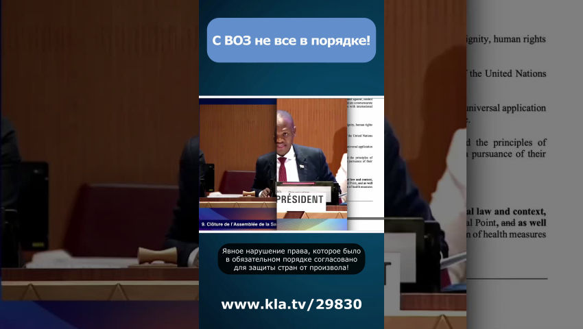 Голосование на Генеральной ассамблее ВОЗ по Международным медико-санитарным правилам (ММСП) явно не соответствовало закону. Процесс голосования также кажется странным... . Поэтому частные, неправительственные спонсоры могут оказывать на Тедроса огромное влияние! Это дает ВОЗ «монополию на истину» по вопросам здравоохранения. Черный день для ВОЗ: серьезные обвинения в сексуальной эксплуатации. ВОЗ попирает демократию! Нашей международной публикацией: "ВОЗ планирует коварный переворот в 194 странах", мы достили более 2,2 миллиона человек, мы предупредили о драматической опасности, которую представляют собой два запланированных договора ВОЗ ещё в апреле 2024 года. Из-за сильного сопротивления стран-членов в преддверии 77-й сессии Всемирной ассамблеи здравоохранения, проходившей с 27 мая по 1 июня 2024 года, не было достигнуто соглашения по проекту текста договора о пандемии. Однако второй договор - очень далеко идущие поправки к Международным медико-санитарным правилам (ММСП) - был сомнительным образом принят в последнюю минуту в ходе "тайной операции" 1 июня 2024 года в Женеве. Это предполагаемое принятие - настоящий скандал! Так называемые ведущие СМИ в основном скрывают это. Вот почему этот скандал безжалостно разоблачается в данной документации! ВОЗ нарушает международное право! Голосование на Генеральной ассамблее ВОЗ по Международным медико-санитарным правилам (ММСП) явно не соответствовало закону. Статья 55.2 нормативно-правовой базы ВОЗ гласит, что текст любой поправки к ММСП должен быть представлен государствам-членам не менее чем за четыре месяца до голосования. Это единственный способ дать государствам достаточно времени, чтобы рассмотреть поправки на предмет всех последствий. Однако на Генеральной ассамблее ВОЗ в мае 2024 года окончательный вариант этого сложного 60-страничного договора был представлен делегатам лишь непосредственно перед запланированным голосованием. Кто сможет внимательно изучить это судьбоносное и скандальное содержимое? Явное нарушение права, которое было в обязательном порядке согласовано для защиты стран от произвола! Процесс голосования также кажется странным. Голосование не проводилось - как это было бы прозрачно - поднятием рук или поименным голосованием. Вместо этого председатель голосования просто спросил, есть ли возражения. И всё. В результате граждане до сих пор не знают, кто на самом деле голосовал за изменения в ММСП. Еще одно вопиющее преступление против всякой прозрачности! Скандальным является и тот факт, что имеются достоверные сведения, подтверждающие, что на представителей различных стран оказывалось сильное давление, чтобы они не выступали против изменений. ВОЗ показала себя организацией, не заслуживающей доверия, нарушающей международное право с полным отсутствием прозрачности в процессе голосования. См. также наше интервью с экспертом по правовым вопросам ВОЗ и юристом доктором Беате Сибиллой Пфайль. ВОЗ игнорирует минимальные демократические стандарты! 1. ММСП не предусматривают никаких надзорных органов или разделения полномочий! Полномочия Генерального директора Тедроса были значительно расширены в результате принятия весьма сомнительных поправок к ММСП. Помимо чрезвычайной ситуации в области общественного здравоохранения, имеющей международное значение, та