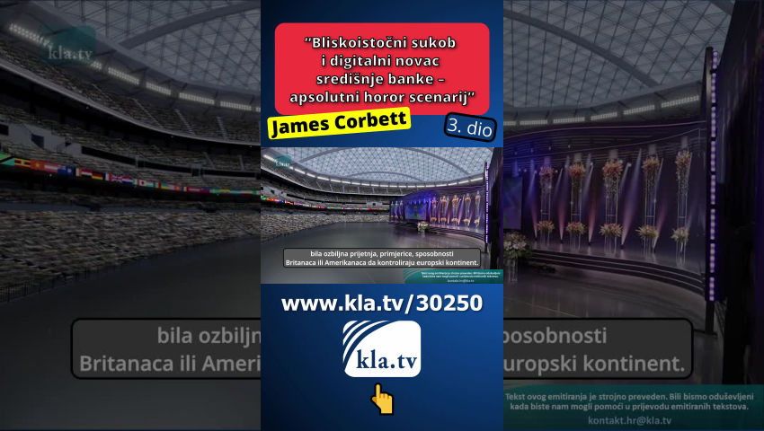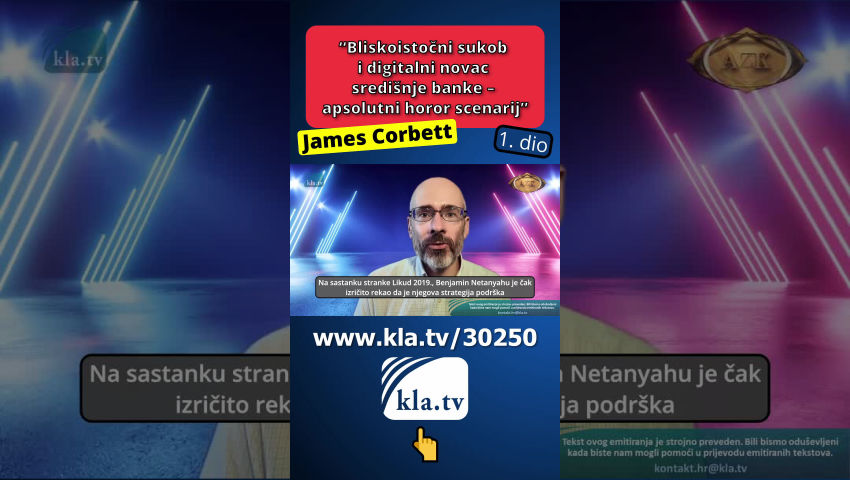 Opće informacije o zakonskim propisima i pravilima AZK nalaze se na kraju predavanja. [Ivo Sasek:] Vau, vau kakav dan! Sada idemo dalje. Dolazimo do sljedećeg stručnjaka. Sada smo koncentrirani na bliskoistočni sukob u sljedećoj rundi i dopušteno nam je postavljati naša eksplozivna pitanja drugom divu prosvjetiteljstva koji živi u Japanu. A s njim će razgovarati i naš fantastični dopisnik Kla.TV-a Dan iz SAD-a. Japan, SAD, mi ovdje u Švicarskoj, tako da ovaj put imamo posla s vremenskom razlikom od 15 sati između ova dva čovjeka i vremenskom razlikom od sedam do osam sati do nas u Švicarskoj. Zahvaljujemo Vam se na vrijednim uslugama i unaprijed pogledajte čiju biografiju? Od James Corbett. James, trebamo te! [Biografija:] James Corbett rođen je i odrastao u Kanadi. Diplomirao je filozofiju na Trinity Collegeu u Dublinu u Irskoj. Nakon preseljenja u Japan, James Corbett je 2007. godine osnovao web stranicu “The Corbett Report” kao platformu za nezavisnu kritičku analizu politike, društva, povijesti i ekonomije. U to je vrijeme vodio web-stranicu istovremeno s poslom učitelja engleskog jezika. Oko četiri godine kasnije postao je istraživački novinar s punim radnim vremenom. Od tada je primio brojne nagrade za svoj novinarski rad i bio je istaknuti govornik na raznim sveučilištima, na TEDxGorningenu [Iniciativa për përhapjen e ideve] i pred neovisnim istražnim odborima kao što je “National Citizens Inquiry” u Kanadi. Tijekom godina, James Corbett je izdao mnoge dokumentarne filmove koji otkrivaju, poput “9/11 Osumnjičeni”, “Stoljeće porobljavanja: Povijest Federalnih rezervi” i “Tko je Bill Gates?” Njegovo dubinsko istraživanje javno je dostupno na njegovoj web stranici i brojnim kanalima u stotinama epizoda podcasta, intervjua i drugih formata. Samo na njegovim društvenim kanalima prati ga preko 300.000 pretplatnika. Godine 2018. pokrenuo je godišnju negativnu nagradu “Nagrade lažnih vijesti”, kojom dokumentira najiskrivljenije vijesti iz medija sustava. James Corbett danas govori o temi “Sukob na Bliskom istoku i digitalni novac središnje banke: apsolutni horor scenarij!” [Anketar:] James Corbett, puno vam hvala što ste ponovno ovdje. [James Corbett:] Nema problema. [Anketar:] Danas ćemo razgovarati o ratu na Bliskom istoku i CBDC-ovima [Digitalne valute središnje banke]. Dakle, ako ste vi spremni i naši slušatelji su spremni, mi ćemo odmah krenuti. Dragi gledatelji, jeste li spremni? [Anketar:] Počnimo s ovim: spomenuli ste 7. listopada kao izraelsku Nine-Eleven [uzrokujući rat u Gazi kroz teroristički napad islamskog Hamasa na Izrael]. Kako to? Kako se ove dvije stvari slažu? [James Corbett:] Pa, očito nisam jedini koji je upotrijebio tu frazu. Zapravo, glavni mediji upotrijebili su ovu frazu odmah nakon napada 7. listopada. I naravno da koriste izraz u kontekstu spektakularnog terorističkog napada velikih razmjera koji nije ono što nam je rečeno i koji opravdava tekući, vjerojatno beskrajni rat protiv terorizma. Koristim analogiju na sasvim drugačiji način jer, kao što oni koji su upoznati s mojim radom znaju, secirao sam lažne terorističke napade 11. rujna iz mnogo različitih kutova, uključujući promatranje traga novca i ratnih igara koje su se dogodile tijekom ovog vremena. I također gledajući neke od osumnjičenih za 11. rujna i pojedince, obavještajne dužnosnike i agencije koji su aktivno radili s Al-CIAdom, također poznatom kao Al-Qaeda. Oni su na mnoge načine podržali nastanak ovih pokreta. Dakle, kada kažem da je 7. listopada bio izraelski 11. rujna, mislim na to u ovom kontekstu, kao namješteni ili isprovocirani false flag događaj koji je korišten kao opravdanje za vojnu i političku agendu koja je već bila unaprijed uspostavljena. [Anketar:] Sada kada kažete da rat nikada neće završiti, ja to vidim kao da kažete da Izrael definitivno ima namjere u Gazi. Vidite li način da se okonča ovaj rat u Gazi? Kako će završiti? Treba li završiti? Mislim, beskonačna stvar je da će, ako i dalje imaju neprijatelje oko sebe, stalno dodirivati državnu riznicu SAD-a kako bi održali dotok oružja. Ali kad govorimo o Gazi, predviđate li kraj ove situacije? [James Corbett:] Nažalost, vidim kako bi tome moglo doći kraj. A većina alternativa nije ugodna. Oni uključuju istrebljenje palestinskog naroda iz Pojasa Gaze. Na to su aludirali brojni ministri u izraelskom parlamentu kada su govorili o uništenju Pojasa Gaze ili isključenju palestinskog naroda. I nažalost, naravno, ti ljudi su odbačeni kao: “Oh, ovo su ekstremne rubne skupine ekstremne desnice. Oni ne predstavljaju većinu izraelske vlade.” No, zanimljivo je primijetiti da Netanyahuova politička koalicija trenutno ovisi upravo o takvim ljudima. Dakle, ideja nije tako mala rubna pojava u izraelskoj politici da će ovo zapravo završiti etničkim čišćenjem Pojasa Gaze. I onda, naravno, tu je pitanje Zapadne obale, gdje je godinama bila otvorena i usklađena politika velikog dijela izraelske političke klase da nastavi i proširi ilegalna naselja. Ovo se događa na Zapadnoj obali. Samo prošlog tjedna, Međunarodni sud pravde [IGH] presudio je u preliminarnoj presudi da je izraelska okupacija okupiranih palestinskih teritorija nezakonita. Ovo još jednom potvrđuje da je ovo nezakonita okupacija i da Izrael mora uložiti sve napore kako bi što prije okončao ono što radi. Ali kako će to onda izgledati? I nažalost, kao što rekoh, vidim puno mogućnosti. Mogu zamisliti mnogo načina na koje bi ovo moglo završiti, posebno u Gazi. Mogao bi, primjerice, završiti potpunim uništenjem palestinskog naroda, ili barem raseljavanjem dovoljnog broja ljudi da daljnji opstanak Palestinaca u Pojasu Gaze učini neodrživim, ili barem otvoriti nove rute i nova područja za naseljavanje Izraelaca u Pojasu Gaze. Ali sve što sliči vojnoj perspektivi, na primjer da bi se Hamas stvarno borio u ratu protiv izraelske vlade i da su st
