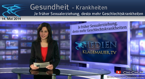 Willkommen, liebe Zuschauerinnen und Zuschauer, zu unserer Sendung über die wissenschaftliche Erkenntnis: Je früher Sexualerziehung, desto mehr Geschlechtskrankheiten. Der Bericht „Sexuell übertragbare Erkrankungen in Europa 1990-2009” des Europäischen Zentrums für Prävention und Kontrolle von Krankheiten belegt die erschreckende Tatsache, dass sich Geschlechtskrankheiten bei jungen Menschen vervielfacht haben. Satte 88 Prozent aller sexuell übertragbaren Geschlechtskrankheiten in den untersuchten Staaten konzentrieren sich auf die vier nordeuropäischen Länder Schweden, Norwegen, Dänemark und Großbritannien. Die Gesundheitsministerien und Gesundheitsbehörden genau dieser Länder jedoch, haben den „Safer Sex“ zur offiziellen Staatspolitik gemacht und Sexualerziehung gehört dort bereits ab der Grundschule zum Unterricht. Somit beweist diese EU-Studie, wie wenig stichhaltig die behauptete Gleichung ist: „Mehr Aufklärung und mehr Prävention – statt weniger Risiken und mehr Gesundheit“. Ganz im Gegenteil scheint eine Übersättigung an Informationen und vor allem die immer frühere Sexualisierung in diesen Ländern offensichtlich zu immer mehr Geschlechtskrankheiten zu führen. Helfen Sie mit, diesen Trend zu stoppen, indem Sie solche Nachrichten weiterverbreiten und damit wirklich präventiv handeln. Besten Dank und „uf Widrluege“.