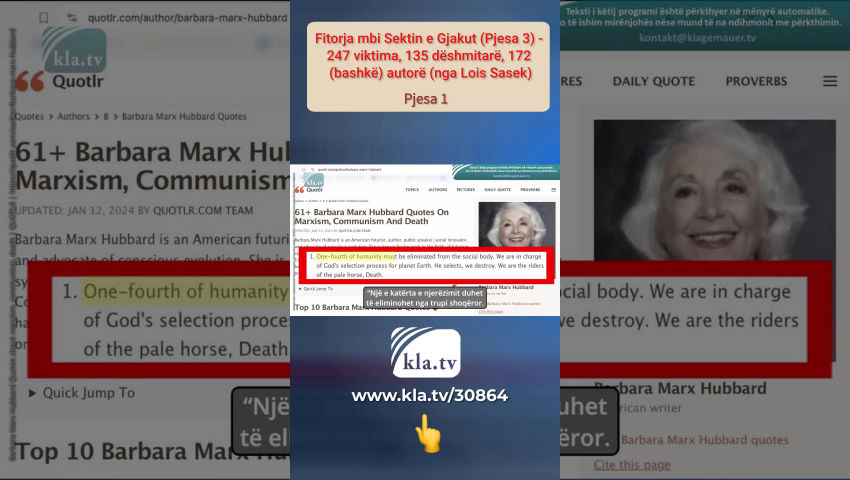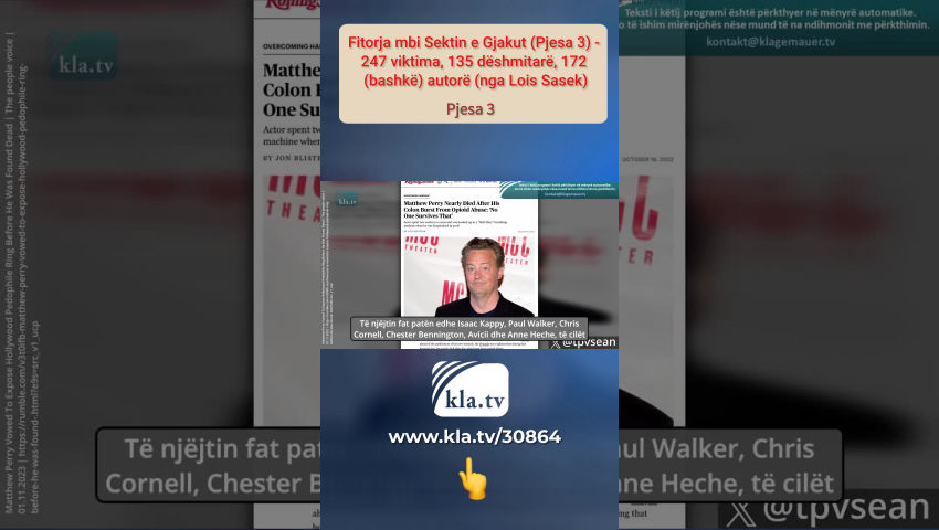 A është e gjitha vetëm art dhe kulturë? Nr. Lois Sasek ka publikuar tashmë 138 raporte nga viktimat e dhunës rituale satanike dhe 77 deklarata të dëshmitarëve për këto praktika mizore rituale në Sektin e Gjakut 1 dhe 2. Këto viktima dhe dëshmitarë përmendën gjithsej 82 autorë dhe vunë në dukje rrjete elitare të autorëve. Tani po shikoni episodin e tretë të "Sektit të Gjakut" me 247 viktima të tjera dhe 135 dëshmitarë që dëshmojnë për dhunën rituale satanike dhe ritualet mizore të flijimit. Ndër të tjera, viktimat përmendën 172 autorë dhe bashkëpunëtorë të tyre. Deklaratat e të mbijetuarve nga e gjithë bota janë në mënyrë të pavarur absolutisht identike dhe paraqesin një pamje të njëjtë, siç përmblodhi themeluesi i Kla.TV, Ivo Sasek në 2015: “Dhe duhet ta dini se këto fuqi satanike tani janë zhvilluar në atë mënyrë që në çdo vend, në çdo kulturë, flijimet e fëmijëve janë bërë si normë për të qetësuar shpirtrat. Ky është mësimi i çmendur i Satanait, Luciferit: se në fund duhej të kishte gjithmonë sakrifica fëmijësh, vrasje dhe vrasje dhe gjakderdhje të pafundme për të qetësuar perënditë. E njëjta gjë në të gjitha vendet. Dhe masakra u bë gjithnjë e më e madhe, dhuna u përkeqësua, perversiteti, perversiteti seksual dhe të gjitha këto gjëra bëheshin gjithnjë e më dramatike.