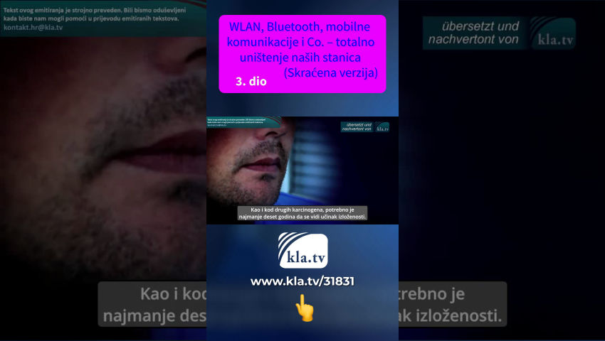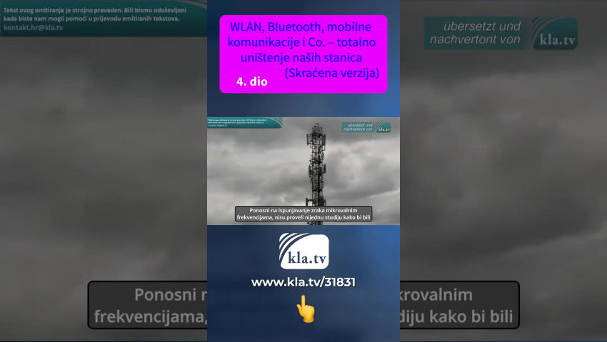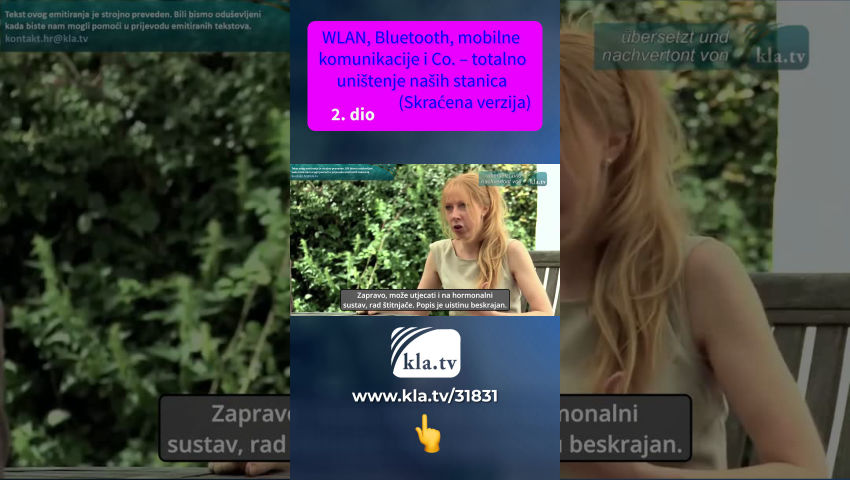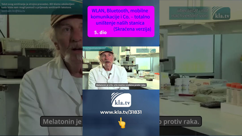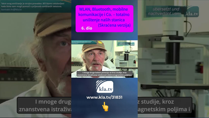 Rezonancija, stvorenje frekvencije Sve više ljudi pati od zdravstvenih problema poput vrtoglavice, glavobolje, srčane aritmije ili nesanice. Često se kao uzrok navodi stres. Sljedeći dokumentarac iz 2012. pokazuje da su takvi simptomi često povezani s potpuno drugačijim, manje poznatim uzrocima. Film nas vodi na putovanje od našeg stvaranja do 1990-ih, kada je počela ekspanzija bežične komunikacijske tehnologije. Od tada je čovječanstvo uronjeno u ocean umjetnih frekvencija. Golim okom planet se čini isti, ali na staničnoj razini to je najveća promjena s kojom se suočava život na Zemlji. Učinke ne treba podcijeniti! Kla.TV je za vas preveo ovaj film na njemački i dodao sinkronizaciju. Znanstvenici, predstavnici industrije, liječnici i oni koji su pogođeni rekli su svoje. Želimo vam puno unutarnjeg dobitka gledanjem sljedećeg dokumentarca Jamesa Russella: “REZONANCIJA – Stvorenja frekvencije”! [Profesor Denis Henshaw, Sveučilište u Bristolu:] Jednostavno još ne razumijemo u potpunosti što radimo. [Radijski glas:]Napokon imamo najavu o tome uzrokuju li mobiteli rak. [Rezonancija - Stvorenja frekvencije] [Pripovjedač:]Nepoznati znanstvenik upravo će doći do otkrića koje je trebalo promijeniti sve. Zvao se Winfried Otto Schumann. Od tog dana poučavao je svoje učenike fizici elektriciteta. Kako područje u području može stvoriti električni napon. I kao rezultat: imamo frekvenciju. Schumannov razred mučio se da shvati temu. Da bi im bilo lakše, profesor ih je uputio da zamisle da je Zemlja jedno područje, a ionosfera drugo područje. Zatim ih je zamolio da izračunaju napon između ovih područja. Kako ni sam nije imao pojma, Schumann je također počeo računati. Puls Zemlje, Schumannova rezonancija, iznosio je točno 7,83 herca. Otkriće je bilo zapanjujuće. Je li Schumannova rezonancija bila samo slična alfa valovima ljudskog mozga? Ne – bilo je identično! Frekvencija mozga, koja kontrolira našu kreativnost, naš učinak, naš stres, naše strahove i naš imunološki sustav, nekako se prilagodila frekvenciji planeta. Puls zemlje postao je puls samog života. Pa, ako pogledate povijest Zemlje, čini se prilično očiglednim. Schumannovi valovi su dio ovog planeta od samog početka. Život se razvija, okružen njima i neizbježno im se prilagođava. Zapravo, naša osjetljivost na frekvenciju postala je duboko povezana s našom sposobnošću da uočimo još jedan fenomen na planetu. [Naslovni glas: Magnetska polja] [br.] [Norman Carrick, British Beekeepers Association (BBKA):]Znamo da su pčele osjetljive na magnetska polja. Znamo da u svojim tijelima imaju čestice geomagnetita. A laboratorijske studije pokazale su da su doista osjetljivi na magnetska polja. U laboratorijima je dokazano da se načinom na koji pčele grade svoje saće može kontrolirati stvaranjem umjetnog magnetskog polja, čini se da pčele koriste magnetska polja za orijentaciju. [Pripovjedač:]Osjetljiva ravnoteža života na Zemlji savršeno je ilustrirana ovisnošću o pčelama i njihovom oprašivanju biljaka. Vjeruje se da bi bez pčela život imao male šanse. [Norman Carrick, British Beekeepers Association (BBKA):]Oprašivanje pomoću insekata potrebno je za gotovo sve što hranu čini zanimljivom: Dakle, voće, orasi, sve to zahtijeva oprašivanje kukcima, a pčele su najvažnija skupina oprašivača. [Naslovni glas: Oko 70% svjetskih prehrambenih usjeva oprašuju pčele.] [Naslovni glas: Godine 2006. dogodilo se nezamislivo: pčelinje kolonije diljem svijeta počele su izumirati, a nitko nije mogao objasniti zašto.] [Pripovjedač:]Ova vrsta uginuća pčela, također poznata kao poremećaj Colony Collapse Disorder (CCD), utječe na pčelinje zajednice diljem svijeta, a neke zemlje prijavljuju gubitke do 70%. Razni razlozi navedeni su kao okidači. Ali nitko od njih nije mogao uvjerljivo objasniti zašto su se pčele odjednom prestale vraćati u svoje košnice - uz jednu iznimku: Senzacionalno istraživanje Jochena Kuhna i njegovog tima. U jednom eksperimentu liječnik je radio s osam pčelinjih zajednica i u četiri od njih stavio običan DECT telefon. Znanstvenici su potom pratili hoće li prisutnost DECT telefona utjecati na to hoće li se pčele vratiti u svoju košnicu. Rezultati su bili zapanjujući. U košnicama u kojima nisu bili ugrađeni DECT telefoni vratio se broj pčela. Ali jedva da se ijedna pčela vratila u košnice u kojima je bio DECT telefon. U jednu od košnica gdje je bio DECT telefon nije se vratila ni jedna pčela. Da bismo u potpunosti razumjeli test doktora Kuhna, prvo moramo razumjeti kako DECT telefon radi. Razlog zbog kojeg možete hodati po kući i telefonirati koristeći svoj DECT telefon je taj što bazna stanica vašeg DECT telefona šalje elektromagnetske valove koji se nazivaju mikrovalovi na vašu slušalicu. To je potpuno isti način na koji mobilni toranj komunicira s mobilnim telefonom. DECT telefon je u biti minijaturna verzija tornja za mobitel. Ako na pčelu utječe ono što dolazi s DECT telefona, sigurno će na nju također utjecati ono što dolazi s tornja mobilne telefonije. A uz 4 milijarde korisnika mobitela diljem svijeta, odjednom se pojavio zastrašujući broj tornjeva za mobitele. Magnetski osjećaj orijentacije pčele omogućuje joj da se orijentira pomoću linija magnetskog polja Zemlje. Vještina u koju je uložila milijune godina razvoja i finog ugađanja. Nije li očito da na tako visoku osjetljivost utječu i najmanje promjene u elektromagnetskom okruženju? Dakle, što znači ova gigantska promjena koja se dogodila gotovo preko noći? Također, postoje li druge vrste koje imaju ovu osjetljivost na magnetska polja? Osjetljivost koja ih u konačnici čini ranjivima na frekvencije koje stvaraju ljudi? Nažalost, otkriće novog proteina zvanog kriptokrom sugerira da sav život ima magnetski smisao. [Naslovni glas: Cryptochrome] [Peter Hore, profesor kemije na Sveučilištu Oxford:] Otkriveni su u biljkama 1990-ih.