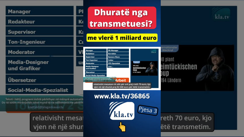 [Lois:] Po të them këtu dhe tani, po të jap këtë vilë të ëndrrave për 12.9 milionë euro me këtë pamje të shkëlqyer. Wow! Dhe pastaj sigurisht kjo varkë e ëndrrave për 520 000 euro. Gjëja e rëndësishme është që ju mund të shtriheni në kuvertë në pjesën e përparme për të thithur diellin. Kjo është arsyeja pse zgjodha këtë model - për ju! Dhe pastaj është ky Maserati për 360 000 euro për ju. Dhe në mënyrë që të mund të jetoni vërtet në luks të pastër, unë do të transferoj 11 656 405 euro para në llogarinë tuaj. Dhe e gjithë kjo nga dashuria dhe kujdesi i pastër. Sepse mijëra kanë punuar nga dashuria vetëmohuese për të në mënyrë që ju ta keni atë. Çfarë do të mendonit? Unë e zgjodha vilën për një kohë të gjatë, ajo duhej të ishte vërtet kjo. Pra, do të mendonit se duhet të ketë një kapje. Pra, nëse kjo ju ndodh thjesht, duhet të ketë një kapje sepse këto ditë, siç thashë, asgjë nuk është falas. Por unë ju them sot se është e vërteta. Po ju them, nuk është metaforë. Kjo është me të vërtetë për vlerën reale. Këtë shumë që ta kam dhënë tani me vilën, me varkën, me makinën cool dhe me paratë në llogarinë tuaj. Kjo përkon me vlerën e prodhimit të vetëm një viti të transmetimeve të Kla.TV. Tani ju i merrni të gjitha emisionet e Kla.TV sot falas. Dhe Kla.TV ka mbi dymbëdhjetë vjet që ekziston. Dhe e gjithë kjo nuk përbëhet vetëm nga vlera e prodhimit të transmetimeve të KLa.TV. Unë do të kthehem në atë më vonë. Por tani do t'ju vërtetoj se ne ju japim shumë më tepër se të gjitha këto. Pra, dymbëdhjetë vilat dhe dymbëdhjetë Maserati dhe dymbëdhjetë varkat luksoze dhe dymbëdhjetë herë njëmbëdhjetë milionë euro. Tani do ta vërtetoj shkurtimisht këtë - dhe, e them përsëri, me të vërtetë nga dashuria. Por ne njohim vetëm mashtrime rreth nesh. Ne njohim vetëm shfrytëzimin sot. Dhe kjo është arsyeja pse askush nuk mund ta shohë atë, edhe nëse një gjë e tillë ekziston vërtet. Dhe nëse kjo është vërtet e vërtetë, atëherë nuk mund ta vlerësoni më atë që po ndodh në të vërtetë këtu. Dhe kjo, të dashur shikues, kjo është pikërisht ajo që supozohet të ndryshojë tani. Dhe unë do t'ju tregoj menjëherë pas sot se si mund të bëheni pjesë e kësaj mrekullie më të madhe të kohës sonë. A po bashkoheni? [Audienca:] Po! [Lois:] Pra, ne shkojmë në uebsajtin e Kla.TV dhe thjesht zgjedhim një program nga shumë me gjatësi mesatare. Unë zgjedh programin “OBSH planifikon një grusht shteti tradhtar në 194 vende”. Le ta hetojmë këtë tani. Këtu mund të shihni një përmbledhje të gjithçkaje që shkon në krijimin e një shfaqjeje të vetme të Kla.TV nga A në Z. Këto janë departamentet që hyjnë në lojë kur prodhohet një emision i Kla.TV. Nëse tani zmadhojmë prodhimin, thjesht në prodhim, do t'ju tregoj një përmbledhje tjetër të përafërt të asaj që përfshihet vetëm në prodhimin e transmetimit. Ky është një numër i pafund marrëveshjesh dhe procesesh pune. Epo, kjo është vetëm për t'ju dhënë një ide të vogël të fushës së veprimit. Por tani le të shohim vetëm vlerën e pastër të punës së këtij emisioni të përzgjedhur të KLa.TV. Dhe tani është vetëm çështja se sa orë punë i kushtohen një emisioni të Kla.TV. Kjo fillon me procesin editorial, i cili përfshin kërkime të gjera, kontrollimin dhe sigurimin e burimeve, vazhdon me shkrimin dhe korrigjimin dhe në fund siguron cilësinë e tekstit. E gjithë kjo krijohet pas punës – ki parasysh, pas punës për këta njerëz të mrekullueshëm – pasi të kthehen nga puna. Më pas vjen koordinimi që kërkon shumë kohë, moderimi, xhirimet, përdorimi i altoparlantëve, produksioni, prezantimet profesionale, zëri, miksimi, redaktimi i versioneve të ndryshme, derisa më në fund të jetë ashtu siç duhet. Dhe ne po flasim vetëm për një emision të Kla.TV. Më pas animacion, montim, film të shkurtër, imazhi i kopertinës. Pastaj e njëjta gjë në gjuhët: përkthim, regjistrim, montim me radhë. Pastaj ka gjithmonë miq të dashur, të cilët, për shembull, kujdesen për fëmijët, ndërsa prindërit bëjnë një incizim. Ose kur mami është duke redaktuar regjistrimet - si këtu në italisht - ai kontrollon fëmijët. Ajo që ndodh në sfond në mënyrë që këta njerëz të mund të kryejnë detyrat e tyre në baza vullnetare nuk përmendet as nga larg në këtë sondazh. Barbara, për shembull, e cila nuk është as në këtë foto, kujdesej për fëmijët e Deborës - kjo është zonja e re në qoshe - që ajo, Debora, të ishte e lirë për prodhim. Dhe ka pafund histori si kjo për të treguar, portugalisht dhe kudo, po. Dhe në praktikë, është ende shumë më tepër përpjekje sesa ajo që kemi renditur në të vërtetë këtu. Por tani ju merrni një pasqyrë të vogël për atë që tashmë fshihet pas një flamuri gjuhësor në Kla.TV. Pas saj qëndrojnë familje të tëra dhe shoqata familjare. Ekipet me shumë pjesëmarrës, miq dhe entuziastë nga e gjithë bota. Këtu, për shembull, mund të shihni një ekip prodhimi direkt nga Filipinet në mes. Ne thjesht po hedhim një vështrim të shpejtë në disa ekipe të tjera. Dhe pastaj është PR kërkuese dhe gjithashtu publikimi. Dhe ju keni parë vetëm një pjesë të fotove, sepse jo të gjithë arritën të më dërgonin fotot në një njoftim kaq të shkurtër. E thënë përafërsisht. Në total, kjo bën një ngarkesë pune prej 1172 orësh për këtë transmetim. Dhe nëse tani e llogarisim këtë me një tarifë relativisht të ulët për orë - ju mund të shihni menaxherët, redaktorët, mbikëqyrësit, inxhinierët e zërit, çfarë tarifash për orë kanë ata, është e pamasë - por nëse tani llogarisim një tarifë relativisht mesatare të ulët për orë prej rreth 70 euro, kjo vjen në një shumë prej 8