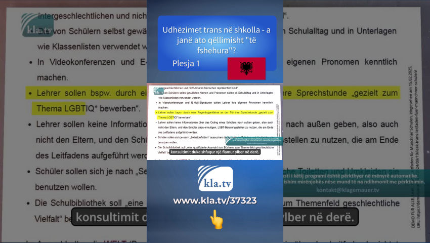 Udhëzimet e reja për institucionet arsimore etj. janë duke u publikuar dhe postuar vazhdimisht në internet. Ka udhëzime që variojnë nga rinovimi i shkollës deri te ndarja e mbetjeve. Por shumë pak njerëz, veçanërisht prindërit, për shembull në Mynih, duket se e dinë se ekziston një udhëzues trans për shkollat e Mynihut. Departamenti i Arsimit dhe Sportit i Qytetit të Mynihut, i udhëhequr nga politikani i Partisë së Gjelbër Florian Kraus, ka publikuar ndër të tjera një udhëzues me “Zyrën e Koordinimit për Barazinë LGBTIQ*” me titull: “Nxënësit trans*, interseks dhe jobinarë në shkollat e Mynihut”. Nuk ka asnjë deklaratë zyrtare nga shoqatat e prindërve dhe lind pyetja: a ishin ata të informuar për rregulloret që përmban udhëzuesi LGBTIQ? Ndryshe nga udhëzimet e tjera të shkollës, si "Udhëzuesi për ndarjen e mbetjeve dhe parandalimin e mbetjeve në shkollat e Mynihut", ky nuk është i disponueshëm në internet. Nëse nuk e dini saktësisht se çfarë po kërkoni, nuk do ta gjeni. Kjo është arsyeja pse lëvizja qytetare “Demo për të gjithë” ka publikuar në faqen e saj një udhëzues të zbuluar për shkollat e Mynihut. [https://demofueralle.de/wp-content/uploads/2024/09/2024-02-06_TIN-Leitfaden-3.pdf ] Çfarë është në udhëzues? • Mësimet duhet të hartohen në atë mënyrë që "të përfaqësohen realitetet e jetës dhe historia e njerëzve trans*, interseks dhe jobinarë". • Emrat dhe përemrat e zgjedhur nga vetë nxënësit duhet të përdoren në jetën e përditshme shkollore dhe në dokumente të tilla si listat e klasave. • Në video-konferencat dhe nënshkrimet me email, mësuesit duhet të tregojnë përemrat e tyre. • Për shembull, mësuesit duhet të "promovojnë në mënyrë specifike temën e LGBTIQ*" gjatë orëve të tyre të konsultimit duke shfaqur një flamur ylber në derë. • Mësuesit nuk duhet t'i zbulojnë askujt informacion rreth daljes së një studenti - përfshirë prindërit - dhe duhet ta inkurajojnë studentin të përdorë shërbimet e këshillimit LGBT të renditura në fund të udhëzuesit. • Studentëve duhet t'u lejohet të zgjedhin se cilat tualete dhe dhoma zhveshjeje duan të përdorin, në varësi të "vetë-përkufizimit" të tyre. • Biblioteka e shkollës duhet të përmbajë “një përzgjedhje të kualifikuar librash me temën e diversitetit gjinor” etj. Ky udhëzues e kthen përmbys jetën e përditshme shkollore sipas specifikimeve të hollit trans. Ndër të tjera, kjo do të thotë se gjithnjë e më shumë libra nga autorë trans apo me tematikë trans do të futen në klasa. Prindërit nuk do të informohen nëse fëmija i tyre dëshiron të provojë seksin e kundërt, dhe tualetet dhe dhomat e zhveshjes, të cilat me të drejtë janë të ndara qartë, nuk do të lejohen më të ndahen qartë në të ardhmen. Dhe pak digresion në qendrat e këshillimit të përmendura në udhëzues, të cilat tani po mbijnë si kërpudha: "E fortë!" është një prej tyre, për shembull. Ajo vepron si një qendër raportimi dhe këshillimi për "urrejtjen në internet". Për të shpjeguar se cilat janë skenarët diskriminues, departamenti ka krijuar disa video që synojnë të tregojnë se çfarë nënkuptohet me "trans-armiqësi". Ata që janë prekur thonë fjalën e tyre, për shembull ata që janë "diskriminuar" si një grua trans (burrë biologjik) në një festë për çiftet lezbike. Në këtë rast, një grua lezbike e kapi personin e prekur nga qafa dhe më pas deklaroi me zë të lartë e habitur se ajo kishte një mollë të Adamit dhe për këtë arsye ishte një burrë. Kjo surprizë u pa si trans-armiqësore. Një shembull tjetër përshkruan një grua tjetër transgjinore (mashkull), së cilës iu tha ndërsa priste në radhë për tualetin e grave se kjo zonë pritjeje ndoshta nuk ishte e përshtatshme për këtë person. Pra, kini kujdes se çfarë tashmë është klasifikuar dhe ndëshkuar si trans-armiqësi! Këto dhe zyra të tjera raportuese financohen me miliona para të taksapaguesve. Por jo vetëm në Mynih ose Turingi është hedhur baza për indoktrinimin gjinor kantoni i Basel-Stadt ka botuar gjithashtu një udhëzues trans për shkollat e tij modele. Ky dokument i udhëzon mësuesit që të indoktrinojnë dhe inkurajojnë fëmijët të identifikohen si transeksualë. Nëse prindërit e një fëmije të tillë janë skeptikë, mësuesit duhet të kontaktojnë autoritetet. Për mësimet e sportit dhe notit, madje edhe për kampet shkollore, një fëmijë i ashtuquajtur trans duhet të jetë në gjendje të zgjedhë vetë se cilat dushe dhe dhoma zhveshjeje përdor. Sipas udhërrëfyesit, çfarë thonë fëmijët e tjerë për këtë duhet trajtuar, por nuk pyetet realisht. Në fakt, kjo do të thotë se vajzat gjashtëmbëdhjetë vjeçare mund të detyrohen të ndryshojnë para një djali. Në parim, parimet udhëzuese janë të njëjta si në Mynih. Udhërrëfyesi ndjek udhëzimet e Trans Lobit deri në detajin e fundit, sipas të cilit “vetëpërcaktimi” arbitrar gjinor i të miturve nuk duhet të vihet në dyshim, por duhet të pranohet plotësisht, edhe nëse kjo ka pasoja negative për fëmijën në fjalë ose për shokët e klasës. Për më tepër, mësuesit duhet të promovojnë në mënyrë specifike identitetin trans të fëmijës, për shembull duke rekomanduar qendra këshillimi LGBT. Nëse prindërit janë skeptikë, mësuesi duhet të kontaktojë shërbimin psikologjik të shkollës dhe Autoritetin Zviceran për Mbrojtjen e Fëmijëve dhe të Rriturve, KESB. KESB – Kla.TV tashmë ka raportuar për këtë – është një autoritet qendror i larguar nga qytetarët dhe po konsumon shuma të mëdha të parave të taksave shtetërore. Për shembull, fëmijët, për shkak të raporteve të dyshimta të rrezikut, edhe të shkëputura nga familjet e paprekura dhe vendosjet e jashtme shihen si një model biznesi financiar! K