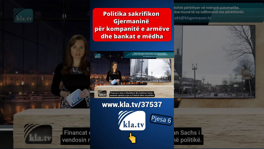 Politikanët po shkelin interesat e votuesve duke mbështetur dukshëm interesat e kompanive të armëve dhe bankave të mëdha! Kursi është duke u vendosur për armatimin ushtarak dhe huamarrjen nga bankat kryesore - për shembull Goldman Sachs. Qytetarët lejohen të mbajnë barrën gjigante të borxhit. Pasuritë e tyre reale shkojnë në financa të larta për të shlyer borxhet e tyre. Financat e larta si BlackRock dhe Goldman Sachs i vendosin njerëzit e tyre si Friedrich Merz në politikë. Dokumentari i Kla.TV “Ndërthurja në hollin e armëve” tregon këto lidhje mes politikës dhe hollit të armëve.
