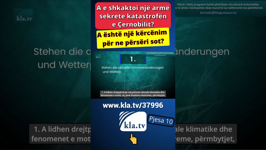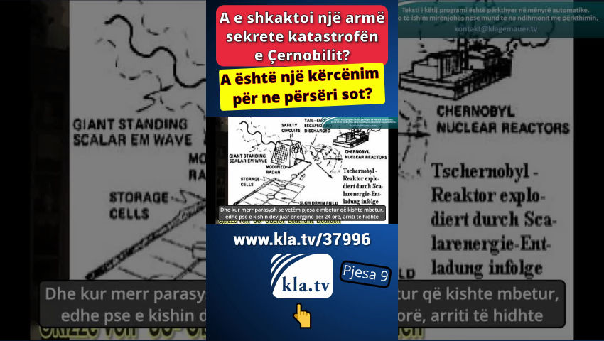 Werner Altnickel, një teknik mjeshtër i televizionit i cili ka qenë i vetëpunësuar që nga viti 1974, është marrësi i çmimit EUROSOLAR 1997 dhe çmimeve të tjera mjedisore. Altnickel hetoi me shumë intensivitet katastrofën e centralit bërthamor të Çernobilit më 26 prill 1986. Kla.TV po transmeton sot një dokumentar nga Werner Altnickel. Në këtë ai demonstron bindshëm se katastrofa e Çernobilit në realitet nuk mund të ketë qenë një “aksident”! Ky dokumentacion nuk ka të bëjë vetëm me analizën historike. Sistemet e armëve të përdorura në atë kohë përbëjnë një kërcënim edhe më të rrezikshëm për ne në situatën aktuale dramatike globale. I. Deklarata shpërthyese nga Prof. Dr. Edmund Lengfelder Gjatë hulumtimit të tij, Werner Altnickel hasi në një artikull nga Martin Ebner të 31 gushtit 2003, në lidhje me një ekskursion me gazetarë në zonën e përjashtimit të centralit bërthamor të Çernobilit me Prof. Dr. Edmund Lengfelder nga Instituti i Rrezatimit Otto Hug në Mynih [Otto-Hug-Strahleninstitut]. Ne citojmë nga raporti “Country party with Geiger counter” (“Ekskursion në vend”) nga Martin Ebner nga 31 gusht 2003: Dhe çfarë janë këto antena gjigante që nuk njihen nga asnjë foto e Çernobilit, por që tani mund të shihen me sy të lirë mbi Pripyat? […] Shpjegimi i Lengfelder: Kjo është përgjigjja e papërfunduar për programin „Star-Wars-Programm“ (“Lufta e Yjeve”) të SHBA-së, përkatësisht dy mure antenash 150 metra të larta dhe 600 metra të gjata. Dhjetë prej tyre duhej të ishin vendosur në një rreth me një diametër prej 35 km për të dërguar rreze me frekuencë të lartë në jonosferë. Centrali bërthamor [në Çernobil] supozohej të siguronte sasi të mëdha energjie për këtë qëllim; supozohej të kishte 16 njësi reaktori. «Kjo do të kishte funksionuar», është i sigurt Lengfelder: […] Prandaj, Çernobili jo vetëm që furnizonte plutonium për bomba [bërthamore], por ishte vetë pjesë e një arme gjigante.” II. Zhvillimi i një superarme ushtarake në Bashkimin Sovjetik Teknologjia e re e rusëve u bë e njohur si "Woodpecker". Termi "Woodpecker" e ka origjinën nga zhurmat e radios të ngjashme me zhurmën e qukapikut me çekiç, të cilat u zbuluan për herë të parë nga operatorët amatorë të radios. Në vitin 1957, një katastrofë e madhe ndodhi në ish-BRSS si rezultat i hulumtimit mbi këtë superarmë skalare ushtarake. Pranë Kyshtym, pranë Mayakut, ndodhej një "objekt kërkimor ushtarak" sekret bërthamor. Kjo katastrofë rezultoi në nivele rajonale rrezatimi njëqind herë më të larta se ato në Çernobil! Ish-nënkoloneli i ushtrisë amerikane, Tom Bearden, ishte analist në Pentagon. Ai ishte një “specialist i provuar i teknologjisë skalare” dhe botoi librin në gjuhën gjermane “Skalartechnolgie”. Ai e shpjegon këtë katastrofë si më poshtë: “Sovjetikët kishin prodhuar një rritje të energjisë në dështimin e tyre të hershëm të Kyshtym. Kjo kishte shkaktuar një shpërthim bërthamor në një impiant aty pranë për ruajtjen e mbetjeve bërthamore! Mbetjet radioaktive kontaminuan rreth 1,200 km², të cilat mbeten jashtëzakonisht të kontaminuara edhe sot e kësaj dite. Gjithashtu dija që sovjetikët kishin instaluar [më vonë] sisteme sigurie në të gjithë transmetuesit e tyre skalorë për t'u mbrojtur nga emergjencat si ajo në Kyshtym. Nëpërmjet këtyre sistemeve të sigurisë, ata donin ta shpërndanin energjinë ngadalë dhe në mënyrë të sigurt në tokë gjatë një periudhe të zgjatur kohore në rast të një qarku të shkurtër në transmetues. Në librin e tij “FER DE LANCE” Bearden vazhdon: “Superarmët e reja u zhvilluan, u prodhuan dhe u vendosën nën drejtimin e KGB-së. Meqenëse ishin tepër sekret, ato nuk iu dorëzuan kurrë ushtrisë së rregullt ruse! Në vitin 1960, ish-kreu i qeverisë së Bashkimit Sovjetik, Nikita Chruschtschow, bëri deklaratën e mëposhtme para presidiumit të Bashkimit Sovjetik në lidhje me armët skalare të ardhshme: “Ne kemi një armë të re – si të thuash, në portofolin e shkencëtarëve tanë. Aq i fuqishëm saqë nëse do të përdorej pa kufi, e gjithë jeta në Tokë do të zhdukej.” III. Superarma ushtarake mund të manipulojë motin! Që në vitin 1962, ish-Presidenti i SHBA-së, Lyndon B. Johnson, tha: “Kushdo që kontrollon motin, do të kontrollojë botën.” Parlamenti Evropian gjithashtu konfirmoi ekzistencën e armëve të tilla të rrezikshme kundër motit në një raport të datës 14 janar 1999 të titulluar “HAARP – Një sistem armësh që ndikon në klimë”! IV. Përpjekje për të kontrolluar superarmën ushtarake Në vitet 1976/77, u prezantua Konventa ENMOD e OKB-së për të parandaluar "sistemet e armëve mjedisore". Ja një fragment nga “Konventa ENMOD”, Shtojca 2: “Shembujt e mëposhtëm ilustrojnë mundësitë që mund të shkaktohen nga përdorimi i teknikave të manipulimit mjedisor: Tërmetet, cunamet, prishja e ekuilibrit ekologjik të një rajoni, ndryshimet në modelet e motit (retë, reshjet, ciklonet dhe tornadot), ndryshimet në modelet klimatike dhe rrymat oqeanike, ndryshimet në gjendjen e shtresës së ozonit dhe të jonosferës. Ish-Sekretari i Mbrojtjes i SHBA-së, Dr. William Cohen, konfirmoi ekzistencën e këtyre armëve të shkatërrimit në masë më 28 prill 1997, në një “konferencë mbi terrorizmin” në Athinë: “Të tjerë [terroristë]madje angazhohen në një lloj eko-terrorizmi, duke ndryshuar klimën, duke shkaktuar tërmete, duke hapur vullkane përmes përdorimit të valëve elektromagnetike. […] Është reale, dhe kjo është arsyeja pse ne duhet të intensifikojmë “përpjekjet tona antiterroriste”! V. Parahistoria tepër sekrete e katastrofës së reaktorit të Çernobilit Nënkoloneli Bearden shkroi në librin e tij “FER DE LANCE”, i cili u botua në nj