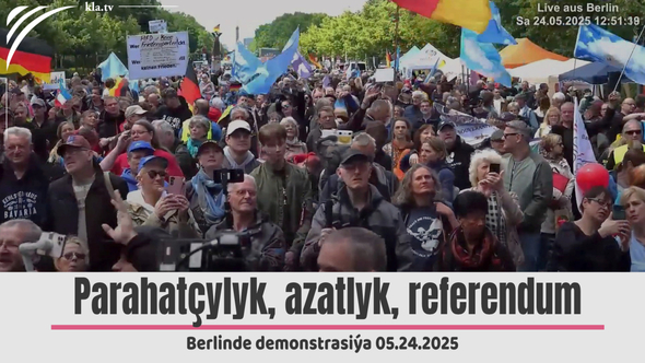 "Biz demokratiýany görkezmän, hakyky demokratiýa isleýäris!" - bu 2025-nji ýylyň 24-nji maýynda, Berlinde geçirilen parahatçylykly demonstrasiýanyň talaplaryndan biri. "Parahatçylyk, azatlyk, referendum!" Şygary bilen müňlerçe adam oryeňiş sütünine ýygnanyp, syýasatçylara demokratiýanyň baştutanynyň, ýagny halkyň näme isleýändigini görkezmek üçin ýygnandy: söweş däl-de, parahatçylyga taýyn bolmak. Erkinlikden mahrum etmek üçin " ok ". Heiko Schöning, ürürgen Elsasser we tanymal spikerler çykyş edýärler! Demonstrasiýadan parçalary şu ýerden görüň.