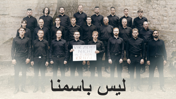 ليس باسمنا ليس باسمنا فيك وفيّ يجري نفس الدم كأبناء وآباء نقف هنا السلام والحرية هما كل خير نعم، من أجل ذلك نعيش ليس الأصل، ليس العرق، ليس الدين ليس هذا ما يفرق بين قلوبنا الحرية والسلام هي الرؤية من أجل عالم يستحق العيش والآن تريدون إجبارنا على قتل بعضنا البعض بوحشية في حين أننا في الحقيقة جميعًا إخوة نقول: ليس باسمنا! لن نخوض حربكم لن نحمل السلاح لأنها لن تؤدي أبدًا إلى النصر نقول: ليس باسمنا! لن نخوض حربكم لن نحمل السلاح لأنها لن تؤدي أبدًا إلى النصر إلى متى سيستمر هذا التحريض على الحرب والسلطة والجشع؟ هل تسمعون صرخات الضحايا تتصاعد إلى السماء من سيوقف هذا الجنون إن لم نكن نحن؟ من يثير الخوف والكراهية والغضب في الناس هو محرض على الحرب وعدو للبشرية هو الذي يقود كل شيء إلى الهلاك وينكر كل إنسانية نقول: ليس باسمنا! لن نخوض حربكم لن نحمل السلاح لأنها لن تؤدي أبدًا إلى النصر نقول: ليس باسمنا! لن نخوض حربكم لن نحمل السلاح لأنها لن تؤدي أبدًا إلى النصر أنتم تسلبون الأطفال آباءهم! خجلوا، أنتم الخونة إذا قادتم الأبرياء إلى المذبح واعتبرتم ذلك أمراً أخلاقياً فأنتم أيها الأمم تتفقون معهم لن يمنحكم أحد السلطة الدماء التي تلطخ أيديكم ستلاحقكم طوال حياتكم! نقول: ليس باسمنا! لن نخوض حربكم لن نحمل السلاح لأنها لن تؤدي أبدًا إلى النصر نقول: ليس باسمنا! لا تستغلونا لغضبكم الكراهية المُثارة مثل البذرة نحن لسنا أبناء الشيطان! نقول: ليس باسمنا! لا تستغلونا من أجل جشعكم أنتم من ستتحملون الضرر لأنكم قريباً ستكونون في مرمى النيران! تعاون في تأليم هذه الأغنية رجال من جنوب ألمانيا يدعون إلى السلام ويرفضون الحرب.