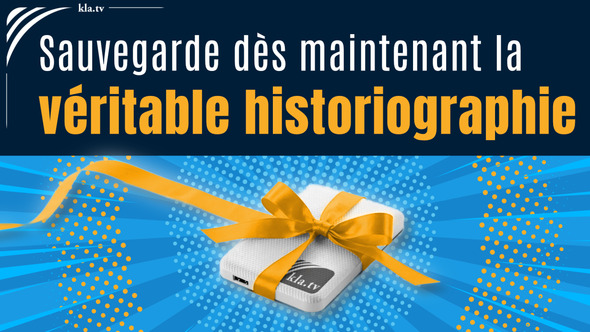 Ukraine/Russie, Israël/Gaza, États-Unis/Iran : sommes-nous au bord d'une Troisième Guerre mondiale ? Dans toute guerre, c’est la vérité qui tombe en premier, et avec elle, l’historiographie authentique. Alors que les gouvernements européens investissent sans compter dans les armes et l’armement, Kla.TV dénonce, à travers plus de 25 000 émissions, les bellicistes et leurs stratégies sournoises. Procure-toi la véritable mémoire historique grâce à Kla.TV-Offline, avant qu’elle ne soit une fois de plus falsifiée. Comment ? Clique maintenant sur le lien dans la description de la vidéo www.kla.tv/2plus et obtiens gratuitement les archives historiques de Kla.TV, estimées à une valeur de travail de plus d’un milliard de francs suisses ! Remplis dès maintenant le formulaire, et tu recevras un disque dur GRATUIT, remis en main propre par un membre de l’équipe Kla.TV de ta région. Vraiment GRATUITEMENT ? Oui, absolument ! Le seul véritable « prix » à payer consiste à copier ces archives historiques uniques et à les transmettre gratuitement à deux autres personnes. Sauve ce monde avec nous !