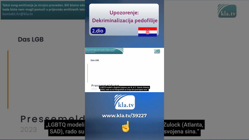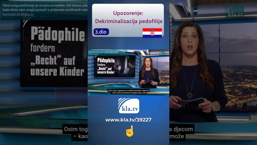 Već prije 20 godina, osnivač Kla.TV-a Ivo Sasek u mnogim je svojim predavanjima upozoravao na barbarske uvjete u društvu koji bi nastali ako se ne zaustave kršenja tabua. U svom predavanju iz 2007. „Zbogom inteligenciji“, izričito je upozorio na razvoj događaja koji se ne zaustavlja na seksualnim napadima na djecu: „Samo želim pokazati da se ono što biste prije samo nekoliko godina, kada smo to prorokovali, smatrali apsolutno nezamislivim, sada događa, [...] ako se ne zaustavi, ako se ne suprotstavi, da nekako preuzmemo kontrolu nad tim razvojem događaja. Doći će vrijeme kada naša djeca više neće biti zaštićena ... Doći će do točke kada će djeca postati poštena igra, slobodan plijen[...]." Je li Ivo Sasek tada previše pričao? Gdje smo danas? Broj prijavljenih slučajeva seksualnog zlostavljanja djece u Njemačkoj značajno se povećao. [Izvješće Saveznog ureda kriminalističke policije BKA: 2023.: 16.375 slučajeva, otprilike 5.000 više nego 2017.] Između 2016. i 2023. broj prijavljenih slučajeva posjedovanja dječje pornografije u Njemačkoj povećao se gotovo osam puta [s 5.687 na 45.191]. Svakih pola sata jedno dijete u Njemačkoj postaje žrtvom seksualnog zlostavljanja, u prosjeku 54 dnevno. Pedofili javno zahtijevaju da se njihova privlačnost prema maloljetnicima prizna kao seksualni identitet. Na web stranici www.wir-sind-auch-menschen.de, pedofilski lobi otvoreno promovira dječju pornografiju s umjetnom inteligencijom, lutke za seks s djecom i način na koji pedofili postupaju s djecom. U ožujku 2023. njemački Savezni ustavni sud presudio je da zabrana dječjih brakova krši temeljni zakon zemlje. U Ujedinjenom Kraljevstvu, golema mreža prvenstveno pakistanskih muslimanskih muškaraca drogirala je, silovala, seksualno iskorištavala ili prodavala stotine do tisuće maloljetnih lokalnih djevojčica u najmanje 50 engleskih zajednica tijekom desetljeća. Za vrijeme bivšeg američkog predsjednika Joea Bidena, trgovina djecom utrostručila se pod krinkom „Open Border Policy“[politike otvorenih granica]za azil. „Pedofilski utjecaji prožimaju naše institucije, našu obrazovnu politiku, čak i naše zakonodavstvo. Žele nas uvjeriti da su kritičari pedofila mizantropi i stoga pravi kriminalci.“ To sugerira da djeca više nisu sigurna ni u jednoj zemlji svijeta. To ukazuje na to da djeca više nisu sigurna ni u jednoj zemlji na svijetu. Očito je ono što je Ivo Sasek rekao prije otprilike 20 godina bilo sve samo ne pretjerano. Naprotiv, upozorio je upravo na ovu situaciju: da djeca i njihovi roditelji uživaju malu ili nikakvu pravnu zaštitu te da ih zakon doslovno progoni i, kako je rekao, proglašava "poštenom plijenom". Zviždačica Tara Rodas bila je dugogodišnja savezna zaposlenica u američkoj Vladi za zdravstvo i ljudske usluge [Uprava za zdravstvo i ljudske usluge Sjedinjenih Država] i to jednako jasno ilustrira: „I to je ono što prosječni gledatelj i većina ljudi jednostavno ne razumije. Da postoje zli ljudi u svijetu koji djecu smatraju robom. I koriste ih u trgovini kao radnu snagu, za trgovinu ljudima radi seksa i za gore stvari. […] Kada imate dijete, možete ga koristiti svaki dan, više puta dnevno, i to je stalan izvor prihoda. To je ono što ljudi trebaju shvatiti, da postoje ljudi koji tako razmišljaju […]. Trenutno se vodi rat protiv djece i ljudi se moraju probuditi i shvatiti da možemo riješiti problem.“ [Bivša zaposlenica HHS-a više od 20 godina] Kako je, pobogu, došlo do ove točke? Opći odgovor na ovo pitanje: korištenje taktike salame. Ovom vrlo sofisticiranom dugoročnom strategijom, nove vrijednosti, norme, smjernice i zakoni su predstavljeni stanovništvu, dio po dio, već mnogo desetljeća – ako ne i stoljeća. Inovacije, propisi i kršenje tabua nihilizma (namjerno raspuštanje morala i vrijednosti) morali su se progutati u ime ljudskih prava. Svatko tko je upozoravao na pretjerane ekscese bio je i jest oklevetan i proglašen mizantropom. Bez ikakve presude, legalizacija braka za sve [2001. Nizozemska; 2013. Engleska i Wales; 2015. SAD; 2017. Njemačka] označila je prvi pravni korak u pravom smjeru. Stručnjaci su već tada upozoravali da će ova legalizacija potkopati tradicionalnu definiciju "braka" i "obitelji", čak i njihovo samo postojanje. Međutim, legalizacija je jasno dala do znanja da se mogu postaviti daljnji zahtjevi u ime ljudskih prava. Nakon toga uslijedila je legalizacija prava na posvajanje za sve; sada se u Njemačkoj nisu mogla posvajati samo pastorčad istospolnih parova, već od 2017. nadalje i druga djeca. U Sjedinjenim Državama to je već bilo moguće od 2015. godine. Ova legalizacija nije bila bez rizika; bilo je sve više izvješća, poput sljedećeg primjera, koji se pojavio u tisku 2023.: „LGBTQ modeli u duginim bojama, par W. & Z. Zulock (Atlanta, SAD), rado su se fotografirali sa svoja dva posvojena sina.“ Kako se kasnije ispostavilo, dječake su silovali njihovi "homoseksualni očevi"; scene zlostavljanja snimane su i distribuirane internetom kako bi se dvojica dječaka potom mogla iznajmiti drugim "homopedofilima". 1. studenog 2024. u Njemačkoj stupa na snagu Zakon o samoodređenju, samoodređenje za sve. Kroz reklamne kampanje u medijima ili kao dio interdisciplinarnih tečajeva spolnog odgoja, djeca se umjetno osvještavaju o sve većem broju seksualnih izbora. Specijalistica za seksualnu medicinu Aglaja Stirn govori o transrodnoj pompi koja se medicinski ne može objasniti. Kao rezultat toga, stručnjaci poput dječjeg i adolescentnog psihijatra Alexandera Kortea primjećuju porast broja školske djece koja vjeruju da su rođena u pogrešnom tijelu, a da se pritom ne radi o transseksualnom razvoju. Mnogi liječnici su stoga kritični. Upozoravaju da će u budućnosti tisuće tinejdžera bez stabilnog identiteta, ali ohrabreni novom osobnom iskaznicom u džepu, također zahtijevati i tražiti medicinsku promjenu spola, a da pritom ni približ