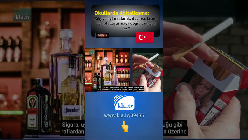 Sigara, uyuşturucu veya sert alkolde olduğu gibi - raflardan yasaklamak yerine, ambalajların üzerine uyarılar basılır veya bağımlılık yardım hatları kurulur. Ancak zaten bağımlı olan kişi - açıkça söylemek gerekirse - artık bu uyarıları duymak için can atmıyor, sadece maddesini istiyor. Reşit olmayanların dijital ortamdan mahrum bırakıldıkları için ebeveynlerini intihar ya da cinayetle tehdit etmeleri dijital uyuşturuculardan farklı değildir! [Daha fazla bilgi: "Dijitalleşmenin tehlikeli etkisi" kla.tv/37936 ]