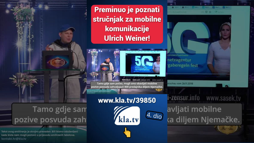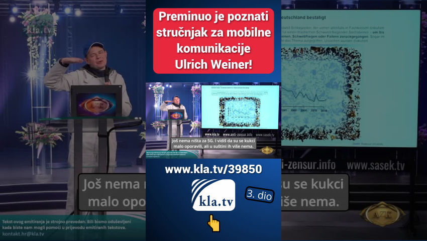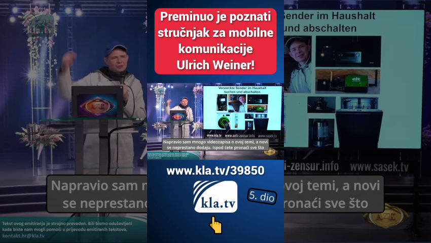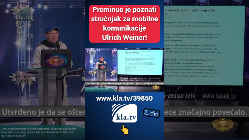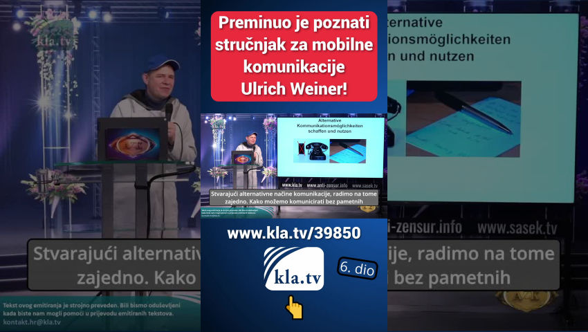 Ulrich Weiner, aktivist protiv mobilnih komunikacija koji je godinama patio od elektrosenzitivnosti, umro je 12. studenog 2025. u dobi od 49 godina. U bezbrojnim predavanjima on je neustrašivo i neumorno upozoravao na opasnosti mobilnih komunikacija više od 20 godina zbog svojih dokazanih fizičkih simptoma! Govorio je na velikim događanjima s tisućama posjetitelja. Njegov nastup na Prvoj konferenciji protiv cenzure 2008. godine, zajedno s dr. Hansom-Christophom Scheinerom, nezaboravan je. Zbog svoje stručnosti pozvan je na panel raspravu o 5G-u u Europskom parlamentu. Bio je u bliskom kontaktu s brojnim građanskim inicijativama koje su se aktivirale u protivljenju izgradnji novih radio-toranja i strastveno ih je podržavao. Svojim neumornim naporima postigao je visoku razinu priznanja u cijelom njemačkom govornom području. Njegovom smrću gubimo istinskog zagovornika prosvjetiteljstva, koji se, unatoč ekstremnim fizičkim i društvenim ograničenjima, beskompromisno i svim srcem protivio velikim tvrtkama mobilnih telefona. Kao dijete, Ulrich je bio vrlo entuzijastičan po pitanju radio tehnologije. Malog Ulija zanimalo je sve vezano uz radiotehnologiju. Kasnije je svoj hobi pretvorio u profesiju i postao tehničar mobilnih komunikacija. Sa 20 godina Ulrich Weiner je već vodio tvrtku s oko 20 zaposlenika. Glavna poslovna područja bila su automobilske telefone, mobilne telefone, mobilne urede i ISDN telefonski sustavi. S povećanom upotrebom digitalne mikrovalne tehnologije počeo je osjećati glavobolje i probleme s koncentracijom. Godine 2002. doživio je masivan slom na zračnoj luci Frankfurt, tijekom kojeg su se pogoršali ritam srca i problemi s vidom. Ulrich Weiner je od 2002. godine aktivno podizao svijest o opasnostima ove mikrovalne tehnologije. Njegovo prvo televizijsko izvješće emitirano je 2003. na TV Südbaden pod naslovom: "Čovjek u bijegu". Nakon toga uslijedilo je još 40 televizijskih nastupa kod velikih medijskih kuća. Pozvan je kao traženi govornik na bezbroj predavanja diljem njemačkog govornog područja. Bio je osobito zabrinut za djecu i mlade koji koriste ovu opasnu tehnologiju i često zbog toga obole. Ulrich Weiner stoga je često držao predavanja u školama. Ovdje je napredovao unatoč fizičkim slabostima i postigao punu pažnju učenika tijekom ovih školskih posjeta. Od svog sloma 2002. godine njegov je život bio borba za preživljavanje. Ako se na vrijeme nije maknuo od zračenja tehnologije mobilnih telefona, teško se koncentrirao, patio je od poremećaja vida, problema s pronalaženjem riječi, glavobolja, pa čak i poremećaja srčanog ritma. Ovo bi moglo dovesti do potpunog kolapsa. Zbog stalne izgradnje novih predajnika, noćenje u karavanu u šumi postalo mu je trajno rješenje. Živio je povučenim životom, neprestano tražeći posljednje preostale zone bez zračenja. Prije nekoliko tjedana, Uli je rekao da vjerojatno uskoro više neće moći držati predavanja na događajima. Rašireno zračenje toliko se dramatično povećalo da mu je izuzetno teško putovati. Ovo impresivno pokazuje da poziv političara i medija da se pod svaku cijenu zatvore sve mrtve zone u mobilnim mrežama nikada ne može biti pravi put. Osobe elektrosenzitivne poput Ulricha Weinera imaju pravo na život! Zato je država također obvezna uspostaviti zone bez zračenja na što većem broju mjesta. U posljednjih nekoliko godina Ulrich Weiner istražuje teme 5G-a, nadzora i alternativa korištenju pametnih telefona. Ostao je nepopustljivo vjeran svom motu: "Nema ugovora za mobitel – apsolutno odricanje". S Ulijem gubimo jednog od najupornijih i najhrabrijih zagovornika u borbi protiv ovog raširenog mikrovalnog zračenja. Ipak, ostaje njegova uvjerljiva ostavština koju je ostavio na vlastitim internetskim platformama, npr. UL-WE.de i također na Kla.TV. Svoje posljednje predavanje održao je 8. studenog 2025. na 22. AZK-u, koje se prenosilo uživo na više od 30 jezika diljem svijeta, a također se može vidjeti online na tim mnogim jezicima na Kla.TV-u od 6. prosinca. S velikom zahvalnošću za sve što je Uli nesebično prenio, danas objavljujemo njegov posljednji govor. To je poput naslijeđa. Ovdje je ukratko sažeo ono što je želio prenijeti čovječanstvu: [Kratka biografija]Ulrich Weiner Bivši entuzijast mobitela i komunikacijski stručnjak Ulrich Weiner razbolio se zbog intenzivnog korištenja mobitela i postao ozbiljno elektrohipersenzitivan (EHS). Čak i kao dijete, Ulrich Weiner bio je fasciniran radiotehnikom. Sa 20 godina već je upravljao tvrtkom s oko 20 zaposlenika. Njegova glavna poslovna područja bila su automobilske telefone, mobilne telefone, mobilne urede i ISDN telefonski sustavi. S povećanom upotrebom digitalne mikrovalne tehnologije počeo je osjećati glavobolje i probleme s koncentracijom. Godine 2002. doživio je masivan slom na zračnoj luci u Frankfurtu, tijekom kojeg su se pogoršali ritam srca i problemi s vidom. Nakon otpusta iz bolnice bio je na bolovanju nekoliko tjedana i nije se mogao pravilno oporaviti kod kuće. Tek kad je odlučio odvesti se u šumu i tamo prespavati, počeo se osjećati bolje nakon dva dana, unatoč mrazu i neudobnom položaju za spavanje. Od sloma 2002. godine, njegov život je borba za preživljavanje. Kada je Weiner dulje vrijeme izložen zračenju mobilnog telefona, teško mu je koncentrirati se, doživljava poremećaje vida, probleme s pronalaženjem riječi i glavobolje, a čak pati od srčane aritmije i potpunog kolapsa. Zbog stalne izgradnje novih odašiljača, život u karavanu za njega je postao trajno rješenje: On sada živi povučeni život na mjestu gdje nema signala za mobilne telefone. Ulrich Weiner je jedan od najpoznatijih kritičara mobilnih komunikacija i edukator o opasnostima radijske i mikrovalne tehnologije. On drži mnoga predavanja o ovoj temi i pojavio se na televiziji više od 40 puta. Na 22. AZK-u Ulrich Weiner ne samo da izvještava o alarmantnom stanju razvoja tehno