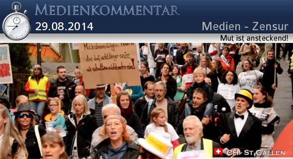Liebe Zuschauer, heute darf ich Sie ganz herzlich vom Augustinerplatz in Freiburg zu unserer heutigen Sendung begrüßen. Am 13. August hatten wir in einem Medienkommentar von mündigen Bürgern berichtet, die in der Karlsruher Innenstadt für bessere Medien demonstriert haben. Auslöser für diese Demonstration in Karlsruhe war die einseitige und großteils unwahre Berichterstattung der Massenmedien über die Ukraine/Russland-Krise. Viele Bürger haben bislang stillschweigend akzeptiert, dass Massenmedien manipulieren und häufig wichtige Fakten unterschlagen. Die Berichterstattung über die Ukraine/Russland-Krise hat für viele jedoch das Fass zum Überlaufen gebracht. Aus diesem Grund sind nun Freiburger Bürger spontan dem Karlsruher Beispiel gefolgt und gehen auch hier in Freiburg auf die Straße. Denn sie sehen keinen anderen Weg mehr, diese offensichtliche Pressezensur zu stoppen. Dass die Mainstreammedien trotz heftigster Proteste der Bürger an ihrer kriegstreiberischen Berichterstattung festhalten, empfinden die Menschen als skandalös. Diese Empörung brachten sie beim Demonstrationszug und der anschliessenden Kundgebung lautstark zum Ausdruck: [Bilder vom Demozug mit Sprechchören] [kurzer Ausschnitt aus der Kundgebung mit wichtigen Fakten zur Falschberichterstattung und daraus resultierender Weltkriegsgefahr] [Interviews mit Teilnehmern: Reporter: Glauben Sie, dass die westlichen Massenmedien durch unwahre und kriegshetzerische Berichte den Frieden in Europa gefährden?] Wir sehen hiermit, dass Mut ansteckend ist. Doch nicht nur die Freiburger ließen sich vom Mut der Karlsruher Bürger anstecken. Die folgenden Kurzberichte zeigen, dass sich anscheinend auch andernorts Menschen vom Karlsruher Beispiel inspirieren ließen… [Kurzbeiträge aus Schwäbisch Hall, Nürnberg, D6, St. Gallen, Österreich, Fotos aus Winterthur und Aarau] Liebe Zuschauer, Diese beeindruckenden Bilder zeigen, dass eine neue Zeit angebrochen ist: Viele Bürger nehmen die Massenmanipulation der Mainstream-Medien nicht mehr widerspruchslos hin und resignieren nicht mehr vor einem vermeintlichen Medienriesen. Die Menschen erkennen zunehmend, dass die Massenmedien durch ihre aggressive, gleichgeschaltete und kriegsfördernde Berichterstattung sogar Völker gegeneinander aufgehetzt haben und somit erhebliche Mitverantwortung an den Kriegen der jüngsten Geschichte tragen. Sie haben auch realisiert, dass eine Wiederholung dieser schrecklichen Kriege nur dadurch verhindert werden kann, indem sie selber wieder Verantwortung übernehmen. Deshalb stellen sie sich der Macht der Mainstreammedien mutig und entschlossen entgegen und decken deren verborgene Machenschaften schonungslos auf. Möchten auch Sie sich aktiv in diesen Schulterschluss gegen die Zensur einreihen und für bessere Medien einstehen? Sicherlich finden auch in Ihrer Nähe ähnliche Veranstaltungen statt, die Sie unterstützen können, denn es gibt überall Menschen, denen diese Anliegen am Herzen liegen. Wir danken Ihnen auch für jedes Weiterverbreiten dieser ermutigenden Sendung. Bleiben Sie mit uns dran. Sicherlich werden wir bald wieder von weiteren Demonstrationen mutiger Bürger berichten können. Auf Wiedersehen aus Freiburg.