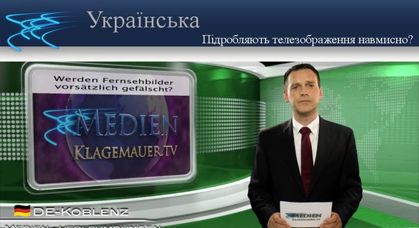 Шановні пані та панове, Підробляють телезображення навмисно? Нас навмисно обманюють в суспільно-правових ЗМІ? Для цих питань я Вас сердечно вітаю на kla.tv. Сьогодні на підставі фактів може бути доведено, що суспільно-правові телеканали в багатьох випадках транслювали підроблені картини. Ці факти ви можете перевірити самі за допомогою джерел, зазначених в кінці передачі.. Один приклад: 29 травня канали "Тагесшау" і "Хойте" послали підроблені зображення збою вертольота, нібито скоєний так званими сепаратистами на Україні. Але показане відео було доказово знято в Сирії і було супроводжено в новинах дивним коментарем: «Ці знімки цілком ймовірно показують військовий вертоліт, який сьогодні збили сепаратисти». Як вже не раз, тут спритно працюють з інформацією у формі можливості, яка в супроводі зі знімками залишається в голові збитого з пантелику глядача, як непорушний факт. За допомогою такої пропаганди брехні, істина навмисно спотворюється і глядачу вселяють неправдиву картину. Німецький телеканал ARD після розкриття обману ввічливо вибачився на своєму інтернет-сайті із словами: «Знімки були очевидно кимось цілеспрямовано маніпульовані». Зріла людина навряд чи зможе обійти висновок, що суспільно-правове телебачення цілеспрямовано прибігає тут до юридичних трюків, щоб при навмисному і свідомому обмані глядачів можливою формою викладу, юридично застрахуватися. Але справжня мета була тим самим все ж досягнута: За допомогою «помилково» хибних знімків поселити в уми людей образ ворога в особі російського терориста-гвалтівника. Передавайте це далі. Доброго вечора.