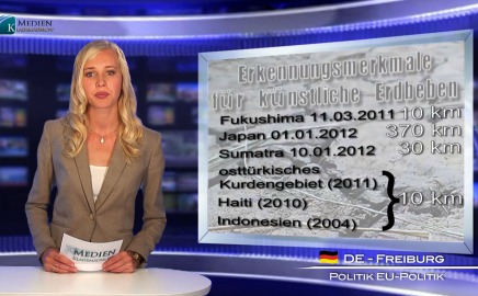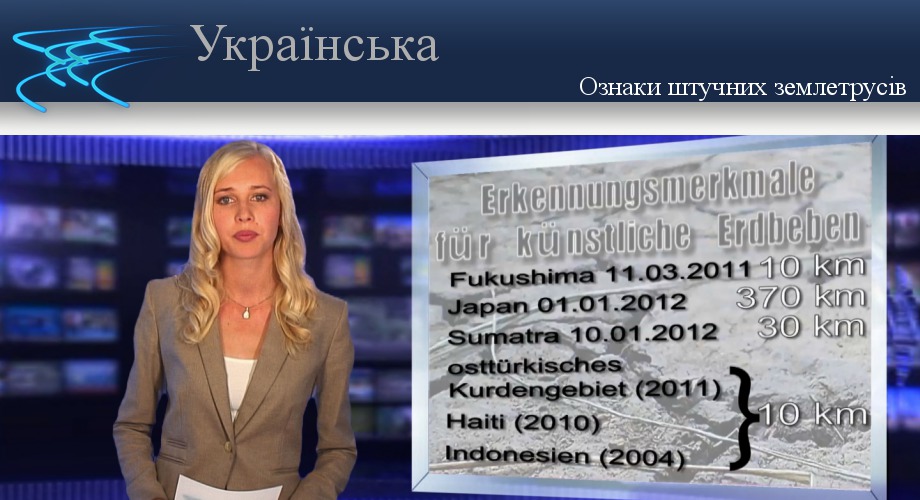 Добрий вечір і ласкаво просимо на Klagemauer TV. У сьогоднішній програмі мова піде про ознаки штучних землетрусів. Що в загалі відрізняє природне від викликаного штучного землетрусу ? При катастрофічному землетрусі 11 березня 2011 року у Фукусімі, епіцентр лежав на глибині рівно 10 км. На цій глибині знаходиться критична точка залягання води. Для порівняння: Новорічний землетрус в Японії 1.1 2012 року зародився на глибині 370 км із силою в 7 балів, але не викликав цунамі, так само і морський землетрус 10.1.2012 біля берегів Суматрі на глибині 30 км із силою в 7,3 бали. Але сейсмографічні виміри спустошливих землетрусів в східній Туреччині, на Гаїті та в Індонезії вказують на глибину точно 10 км. До того ж під час цих землетрусів була доведена електромагнітна активність систем озброєння типу HAARP на Алясці. Під час таких військових дослідів іоносфера Землі нагрівається на вимірювані 3 градуси за Цельсієм. Типово, наприклад, і те, що немає ні яких перед-землетрусів – це все ще зрадницька помилка акторів? Так чи інакше! Хто зупинить цих розробників зброї ? На цьому питанні я прощаюся з вами і бажаю Вам приємного вечора.