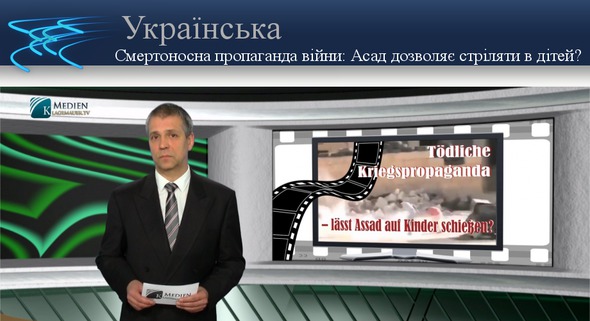 ARD, найбільша телерадіокомпанія Німеччини, випустила відеокліп «Вбивці-кати диктатора Асада стріляють у юного героя, хлопця, який рятував свою сестру». Драматичний відеокліп досяг мільйонів глядачів на YouTube, а також був широко поширений на інших соціальних платформах. Народ обурений, майже готовий сам іти війною: необхідно вжити заходів, щось зробити проти цього, нарешті, ґрунтовно навести порядок, такий ефект кліпу. ЗМІ і уряд США вміло використовують це відео. Як вид міжнародної інфільтрації, цей кліп послужив остаточним доказом того, наскільки режим Асада є жорстоким . Як завжди в одному і тому ж дусі: «Ми ж про це вже давно говорили, але нам не хотіли вірити по-справжньому». Але що ARD та інші, так звані суспільно-правові ЗМІ, ретроспективно нібито не знали - це те, що і це відео є також грубою фальсифікацією., Подібно до брехні про інкубаційні камери в Іраку, на світ вийшла брехня, що стратегічно підбурює до війни, небезпечна для суспільства: - обман, який нацьковує цілі народи. Як легко ця вигадана історія, якби не була викрита, могла б спричинити тисячі смертей, як це було в 1990 році в Іраку через брехню про інкубаційні камери або в 1964 році через брехливе радіоповідомлення, яке призвело до В'єтнамської війні , яка потягнула за собою 3 млн жертв. Нагадуємо, що документи, розсекречені 30 листопада 2005 року американською секретною службою АНБ, підтверджують, що оповіщення американського президента Джонсона про напад Північного В'єтнаму було цілеспрямовано сфальсифіковане за допомогою одностороннього підбору радіоповідомлень. Документи з Пентагону, що з'явилися в 1971 році, і спогади Роберта МакНамари 1995 року вже і раніше без сумніву підтверджували, що уряд США використав інциденти, свідомо брехливо виклавши їх для втілення запланованого ще в 1963 році прямого військового вторгнення. Але, на жаль, без єдиного своєчасного наслідку. Може тут цілеспрямовано розраховують на закінчення строку позовної давності? Хто ж справедливо і своєчасно відплатить за злочин, що здійснюється тепер над Сирією? Чи можуть дозволити собі Об'єднані Нації, чи можуть державні органи прокуратури зменшити усе це до простого прийому якогось там автора фільмів? У тому сенсі: адже нічого ж не сталося! У випадку з авіадиспетчером, через помилкові вказівки якого два роки тому ледь не сталося зіткнення двох літаків в Цюріху, прокуратура вирішила, що цьому обов'язково має наслідувати покарання. Вона пояснила авіадиспетчерові, що все могло статися в разі його помилкової вказівки. Це ні в якому разі не повинно залишитися без покарання, заявила в той час прокуратура. За відомим принципом: "Перед законом всі рівні", ці незмірно більш трагічні військові підбурювання, у порівнянні із зіткненням літаків, отже, ні в якому разі не повинні залишитися безкарними! Обдурені народи необхідно повною мірою просвітити про наклеп, що стався. Крім того, необхідно поставити питання, хто саме дав завдання написати такий небезпечний сценарій, який обманює народи? У всякому разі, справжні кадри наявного фільму-обману, не показують в них жодного задіяного сирійця. Без сумніву, там вдається розпізнати режисера, що говорить англійською мовою та навчає дітей. Все це доводить, як легко можуть уряди,що займаються військовим підбурюванням, ховатись за компаньйонами і соціальними ЗМІ, які знімають фі