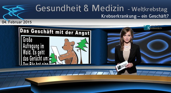 Krebs ist heutzutage, nach den Herzkreislauferkrankungen, die zweithäufigste Todesursache. Viele Menschen sind durch die Medien so programmiert: Diagnose Krebs – ich sterbe. Sobald sie diese Diagnose erhalten, wenden sie sich voller Todesangst an den Arzt und sind bereit fast jede Therapie, häufig Chemo- oder Strahlentherapie, über sich ergehen zu lassen. Das Problem der Behandlungswahl dabei ist: der finanzielle Anreiz für den Arzt, die behandelnde Klinik und die Pharmaindustrie! Eine Chemotherapie kann pro Infusion bis zu 20.000 Euro kosten. Bei viermal durchgeführten Infusionen zahlt die Krankenkasse also insgesamt 80.000 Euro für die Behandlung nur eines Patienten – aus wirtschaftlicher Sicht sehr profitabel für Arzt und Pharmaindustrie. Es gibt verschiedene natürliche Ansätze um Krebserkrankungen zu heilen. Aufgrund mangelnder finanzieller Anreize und der Unmöglichkeit Pflanzen zu patentieren, werden diese jedoch nicht erforscht, sondern unterdrückt, unglaubwürdig und teils lächerlich gemacht. Der Medizinprofessor und Vorsitzende der Arzneimittelkommission der deutschen Ärzteschaft, Wolf-Dieter Ludwig, sagte: „Die Gesundheitsbehörden sind auf eine Kampagne der Pharmakonzerne hereingefallen, die mit der vermeintlichen Bedrohung (hier: Schweinegrippe) schlichtweg Geld verdienen wollten.“ Zum Abschluss unseres heutigen Programmes zeigen wir Ihnen noch die kleine Geschichte: „Das Geschäft mit der Angst“. Damit verabschiede ich mich von Ihnen und wünsche Ihnen noch einen guten Abend.