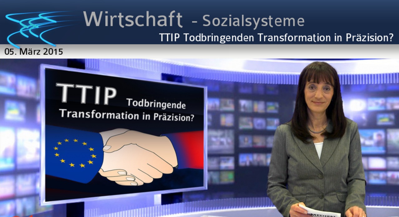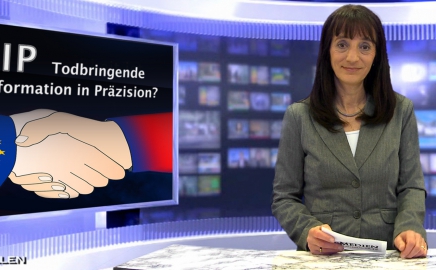 Guten Abend und herzlich willkommen auf kla.tv. TTIP – ist Ihnen dieses Kürzel ein Begriff? Es handelt sich dabei um ein aktuell verhandeltes Freihandels- und Investitionsschutzabkommen in Form eines völkerrechtlichen Vertrages zwischen der Europäischen Union und den USA; offiziell Transatlantische Handels- und Investitionspartnerschaft. Haben wir es bei TTIP mit einer todbringenden Transformation (das heisst einer Umwandlung) in Präzision zu tun? Was soll denn durch TTIP alles abgeändert bzw. regelrecht ausgemerzt werden? Alles, was dem Profitstreben der weltweit agierenden Konzerne im Wege steht. Die zu erwartenden Folgen davon: mehr ungetestete Chemikalien in Kosmetika, Wegfall der Kennzeichnungs¬pflicht von gentechnisch veränderten Nahrungsmitteln, Fleischproduktion mit Wachstums¬hormonen und Antibiotika, Privatisierung der Wasserversorgung und schlussendlich Klagerecht der Konzerne gegen nationale Arbeitsschutz- und Gewerkschaftsrechte. Diese Lebensbedrohungen sind durchsetzbar, weil ein außerstaatliches Schiedsgericht, weltweit beherrscht von 15 spezialisierten Anwaltskanzleien, ein einziges Kriterium hat: Gewinn um jeden Preis – abgesichert durch sogenannte Investitionsschutz-Sonderrechte, die quasi alles erlauben, was gegen nationales Recht und Gerechtigkeit, ja gegen das Leben selbst steht. Bevor wir für weitere Informationen zu diesem Thema an unser Studio in Chur weitergeben, möchte ich mich mit einem passenden Zitat von dem australischen Physiker John O'Malley Bockris verabschieden „Die Öffentlichkeit ist weit mächtiger als die großen Kartelle. Doch die Öffentlichkeit schläft.“ Guten Abend.
