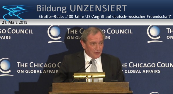 Mein Name ist Nick Brand und ich bin Direktor der gemeinsamen Programme bei „The Chicago Council on Global Affairs“. Danke Ihnen, dass sie gekommen sind. Ich nutze diese Möglichkeit für die Begrüßung von George Friedman hier bei „The Chicago Council“. Ich denke, er ist zum ersten Mal hier, danke, dass Sie bei uns sind. George Friedman: „Kein Ort kann auf Dauer friedlich bleiben. Auch die USA nicht, ich meine, wir (USA) werden stets von Kriegen begleitet (bzw. betroffen). Europa wird, wie ich vermute, zwar nicht zu den großen Kriegen zurückkehren, aber es wird wieder zum menschlichen Normalfall zurückkehren: Es wird seine Kriege haben, seine Friedenszeiten und es wird seine Leben verlieren. Es wird keine 100 Millionen Tote geben wie im letzten Krieg, aber die Idee von der europäischen Auserwähltheit wird, wie ich denke, dazu beitragen. Es wird Konflikte in Europa geben, es gab schon Konflikte in Jugoslawien und jetzt auch in der Ukraine. Europas Beziehungen mit den Vereinigten Staaten – wir haben keine Beziehungen mit Europa. Wir haben Beziehungen mit Rumänien, mit Frankreich, aber es gibt kein „Europa“, mit dem die USA Beziehungen hätte.“ Frage aus dem Publikum: „Ist der islamistische Extremismus die Hauptbedrohung für die Vereinigten Staaten, und wird er absterben oder wird er auch weiter fortbestehen?“ George Friedman: „Er ist ein Problem für die Vereinigten Staaten, aber keine existentielle Bedrohung. Man muss sich damit angemessen befassen. Wir haben andere außenpolitische Interessen. Das Hauptinteresse der US-Außenpolitik während des letzten Jahrhunderts, im Ersten und im Zweiten Weltkrieg und im Kalten Krieg waren die Beziehungen zwischen Deutschland und Russland, weil vereint sind sie die einzige Macht, die uns bedrohen kann. Unser Hauptinteresse galt sicherzustellen, dass dieser Fall nicht eintritt. Wenn Sie ein Ukrainer sind, werden Sie die Ausschau danach halten, wer Ihnen als Einziger helfen kann, und das sind die Vereinigten Staaten. Letzte Woche oder etwa vor 10 Tagen war der Oberbefehlshaber der amerikanischen Bodentruppen in Europa, General Ben Hodges, zu Besuch in der Ukraine. Er kündigte dort an, dass die US-Militärberater in die Ukraine demnächst offiziell kommen sollen. Eigentlich hat er dort die Medaillen an die ukrainischen Kämpfer verteilt, obwohl das US-militärische Protokoll das verbietet, dass Medaillen an Ausländer verliehen werden. Doch er tat das, weil er damit zeigen wollte, dass die ukrainische Armee seine Armee ist. Dann ging er weg. Und nun liefern die Vereinigten Staaten den baltischen Staaten Waffen, Artillerie und andere Militärausrüstung – den baltischen Staaten, Rumänien, Polen und Bulgarien. Das ist ein sehr interessanter Punkt. Gestern haben die Vereinigten Staaten angekündigt, dass sie vorhaben, Waffen in die Ukraine zu liefern. Das wurde dementiert, aber sie tun das, die Waffen werden geliefert. Und bei all diesen Handlungen agieren die USA außerhalb der NATO. Denn NATO-Entscheidungen müssen von allen NATO-Mitgliedern einstimmig getroffen werden. Der Punkt bei der ganzen Sache ist, dass die USA einen „ Cordon Sanitaire“ (einen „Sicherheitsgürtel“), um Russland herum aufbauen. Und Russland weiß das. Russland glaubt, dass die USA beabsichtige, die Russische Föderation zu zerschlagen. Ich denke, wir wollen sie nicht töten, sondern nur etwas verletzen bzw. Schaden hinzufügen. Jedenfalls sind wir jetzt zurück im alten Spiel. Und wenn Sie einen Polen, Ungarn oder Rumänen fragen, sie leben in einer ganz anderen Welt als die Deutschen, und die Deutschen leben in einer ganz anderen Welt als die Spanier. Also es herrscht Uneinigkeit in Europa. Aber was die Ukrainer bevorzugen werden, das werde ich Ihnen genau sagen: sie werden versuchen, die USA in ihr Land zu holen. Die Vereinigten Staaten aus ihrem fundamentalen Interesse kontrollieren alle Ozeane der Welt. Keine Macht hat das jemals getan. Aus diesem Grunde marschieren wir in die Völker dieser Welt ein und sie können nichts dagegen tun. Das ist eine sehr schöne Sache. Die Aufrechterhaltung der Kontrolle über die Ozeane und im Weltall begründet unsere Macht. Der beste Weg, eine feindliche Flotte zu besiegen, ist zu verhindern, dass diese gebaut wird. Der Weg, den die Briten gegangen sind, um sicherzustellen, dass keine europäische Macht die Flotte bauen konnte, ist, dass die Europäer einander bekämpften. Die Politik, die ich empfehlen würde, ist die, die Ronald Reagan angewandt hat, im Iran und im Irak. Er unterstützte beide Kriegsseiten, sodass sie gegeneinander kämpften und nicht gegen uns. Es war zynisch, es war nicht moralisch vertretbar, aber es funktionierte. Und das ist der Punkt: die Vereinigten Staaten sind nicht in der Lage ganz Eurasien zu okkupieren. In dem Moment, wo unsere Stiefel den dortigen Boden berühren, sind wir demographisch zahlenmäßig unterlegen. Wir können eine Armee zerschlagen, aber wir sind nicht in der Lage, den Irak zu besetzen. Schon die Idee, dass 130.000 US-Soldaten ein Land mit 25 Millionen Menschen okkupieren… Das Verhältnis zwischen der Anzahl der Polizisten und der Einwohner von New York ist größer, als das Verhältnis von US-Soldaten und der irakischen Bevölkerung war. Also, wir sind nicht in der Lage, überall militärisch zu intervenieren, aber wir sind in der Lage, erstens, die gegen einander kämpfenden Mächte zu unterstützen, damit sie sich auf sich selbst konzentrieren können – sie zu unterstützen: politisch, finanziell, militärisch, Waffen liefern und die US-Berater aussenden. Und in außerordentlichen Fällen, wie wir in Japan vorgegangen sind, nein, in Vietnam, Irak und Afghanistan, mit Präventivschlägen („spoiling attacks“) intervenieren. Die Taktik der Präventivschläge beabsichtigt nicht, den Feind zu besiegen, sondern sie verfolgt das Ziel, den Feind aus der Balance zu bringen. Das versuchten wir in jedem Krieg wie z.B. in Afghanistan, wo wir Al Qaida au