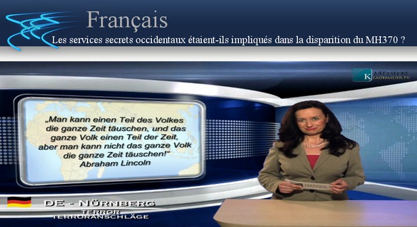 Un grand merci au studio de Rottweil. Cela fait plus d'un an que l'avion MH370 de la compagnie aérienne malaisienne a disparu. Il a probablement été vu pour la dernière fois au-dessus des Maldives. Des témoignages concordants d’habitants d'une île des Maldives parlent d’un jumbo-jet avec des bandes rouges très similaire à l'avion MH 370, volant à très basse altitude. Pour les insulaires c'était un évènement spécial car selon eux il n'y a jamais eu d'avion volant à une altitude aussi basse au-dessus de leur île. Curieusement, lors des derniers contacts présumés avec les radars malaisiens, le MH370 volait plutôt en direction de l'ouest et non pas vers le sud. Toutefois, les grandes recherches n'ont pas eu lieu près des Maldives, mais selon les indications de l’opérateur satellitaire américano-britannique Immarsat, bien loin de là, au large de de l'Australie. Est-ce qu'on voulait attirer l'attention sur une toute autre région? L'ancien Premier Ministre malaisien, Ma-hathir Mohamed a déclaré que les re-cherches au large de l'Australie de l'ouest étaient une perte de temps et d'argent. Il accusait le CIA d’être au cou-rant du lieu de la disparation de l'avion. Le journal malaisien Utusan Malaysia a aussi soupçonné la CIA d'être impliquée dans cet incident. Mais est-ce qu'il y a des indices pour cela? Un indice important est le contexte selon lequel, selon les informations du journaliste d’élucidation Gerhard Wisnewski, il y avait justement ce jour-là de grandes manœuvres de l’armée américaine dans cette région. Thème des manœuvres : un avion disparaît et il faut le trouver. Cela réveille des souvenirs du 11 sep-tembre 2001, il y avait aussi une grande manœuvre exactement le jour de l'at-taque sur le World Trade Center. Thème de la manœuvre: Des terroristes kidnap-pent des avions afin de les conduire comme des bombes volantes contre des tours. De même pendant les attentats à la bombe de 2005 à Londres et pendant le marathon à Boston, il y avait curieusement le même jour des manœuvres des unités spéciales du gouvernement avec exactement le même thème que ce qui s'est passé plus tard en réalité. En examinant de plus près l'attentat terroriste de Breivik on a découvert le même modèle. Le même jour il y avait aussi une manœuvre avec un thème identique. S’agit-il vraiment juste d’un hasard si de telles manœuvres coïncident avec de grands attentats terroristes? Avec une telle fréquence, sûrement pas! Dans le cas du MH370 les militaires US savent-ils plus de choses que ce qu'ils ont admis en public? Sur ces questions et d’autres similaires, le public mondial se laisse berner avec des réponses et des explications qui ne sont pas satisfaisantes. Et comme le public n’insiste pas pour avoir une élucidation complète de toutes les incohérences et des évènements douteux comme un avion qui disparaît apparemment sans laisser de trace, cela se répète sans cesse. Et c'est aussi parce qu'un reportage indépendant et non censuré n'est pas accessible à tous. Chers téléspectateurs, c'est pour cela que nous vous prions d'attirer l'attention sur nos émissions. Abraham Lincoln l'a déjà dit : Vous pouvez tromper quelques per-sonnes tout le temps. Vous pouvez tromper tout le monde un certain temps. Mais vous ne pouvez pas tromper tout le monde tout le temps. Je vous souhaite une bonne soirée!