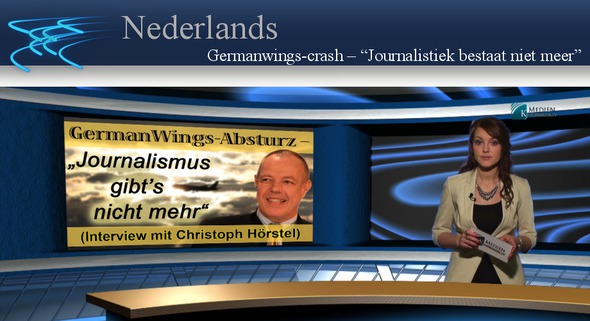Goedenavond dames en heren, Op 24 maart is een airbus van de Germanwings op weg van Barcelona naar Düsseldorf neergestort in de Franse Alpen. Alle 150 mensen aan boord kwamen daarbij om het leven. Nadat de stemrecorder was geanalyseerd, kozen de overheidsdiensten - o.a. de leiding van Lufthansa- onmiddellijk voor een zelfmoordtheorie. Ondanks massale tegenspraak werd dit toch door de regerende media verkondigd. Haar verslaggeving beperkte zich vanaf dat moment overwegend op de co-piloot die het vliegtuig met opzet op de bergwand af zou hebben gestuurd. Volgens de Schweizer Radio Fernsehen (afgekort SRF), zou op 2 april de tweede zwarte doos: de flight recorder (doos met vluchtgegevens), zijn gevonden. Uit de gegevens van deze tweede doos zou af te leiden zijn dat de co-piloot het vliegtuig bewust deed dalen en de snelheid opdreef. Volgens SRF deelde de Franse onderzoeksautoriteit BEA dit mee. SRF komt op grond van de vaststellingen tot de conclusie, ik citeer: “De puzzel van de crash voegt zich meer en meer bij elkaar." Zij bedoelen daarmee de puzzel van de zelfmoordtheorie. Het is opvallend dat de hoofdmedia zich bijna alleen nog maar bezighoudt met de zoektocht naar het puzzelstukje dat zich beperkt tot de co-piloot als oorzaak van de crash. Maar heeft dat werkelijk nog iets met gewetensvolle journalistiek te maken, zoals vereist door de perscodex? Ik citeer uit artikel 2: “Om bepaalde informatie in woord , beeld en video openbaar te maken, moet alles in de gegeven omstandigheden zorgvuldig worden onderzocht op waarheid en waarheidsgetrouw worden weergegeven. Als antwoord op deze vraag laten wij u aansluitend een deel van een interview zien met de Duitse journalist Christoph Hörstel dat van toepassing is op de journalistiek van de Germanwings-crash. Christoph Hörstel bracht o.a. van 1985 tot 1999 voor de ARD verslag uit vanuit Afghanistan, Pakistan en Kasjmir en hij is vakinhoudelijk goed op de hoogte. Wat de journalistiek over de Germanwings-crash betreft, ziet Hörstel een heel nieuwe toestand die is ontstaan en, waar we ons moeten van bewust worden, ik citeer: “Het is heel eenvoudig: journalistiek bestaat niet meer”. Het beste wat wij hierover kunnen zeggen, en Hörstel meent dat ook zo: “Ze liegen allemaal!” De populaire media zouden weigeren om echt te onderzoeken; ze presenteren het toenemend radeloze publiek opzettelijk misleidende verhalen. Deze misleidende stellingen worden niet herzien maar dan plots zou men het eens zijn over zelfmoord. Hörstel noemt verschillen voorbeelden, daarvoor zoals redacties zouden opzettelijk slecht en slordig onderzoeken; veel onopgehelderde dingen en essentiële tegenstrijdigheden worden gewoon gelaten. Als voorbeeld noemt Hörstel de melding van een noodoproep die de Franse vluchtleiding ontving van de cockpit van het Germanwing vliegtuig, 10 minuten vóór de eigenlijke crash. Maar “Bild.de” en anderen meldden dat er geen noodoproep zou zijn geweest. "Niemand heeft onderzocht", zei Hörstel: “waarom die eerste berichtgeving en dan die (andere) tweede? Wat is nu de juiste?” Als ander voorbeeld noemde Hörstel de drie Franse gevechtsvliegtuigen die in het crashgebied waren, waar in een normale situatie, volgens alle ooggetuigenverslagen, maar één machine vliegt???? Verschillende pogingen tot opheldering deden de ronde maar zijn dan onopgehelderd gebleven. Uiteindelijk bleek men het eens te zijn over de zelfmoordtheorie. Zo zijn er over Germanwings nog verschillende andere voorbeelden van persmededelingen die louter op speculaties berusten. Fundamentele vragen en ongerijmdheden worden echter nauwelijks nagegaan. Zo maakten wij in onze uitzending van 30 februari melding dat het probleem van de zeer giftige cabinelucht wat bekend is en een mogelijke oorzaak van het ongeluk zou kunnen zijn. Hoor nu zelf hoe Cristoph Hörstel getuigt van het einde van de journalistiek als gevolg van een nieuwe dimensie van speculatieve, niet ernstige tot zelfs misleidende verslaggeving. Ik wens u nog een goede avond. Interviewer: Hartelijk welkom bij NuoViso-In gesprek. Voor de tweede maal dit jaar heb ik de publicist en regeringsadviseur Christoph Hörstel uitgenodigd en alhoewel het jaar pas drie maanden oud is, hebben wij alweer voor de tweede keer veel te bespreken. Beginnen wij met het meest actuele mediabericht, de crash van de GermanWings machine. Is er dan aan de actuele mediaberichten, die van een suïcide van de copiloot uitgaan, nog iets toe te voegen of is het verhaal na drie dagen zuiver opgehelderd. Hörstel: Er is een heleboel toe te voegen en ik wil een ding van tevoren duidelijk stellen. Voor de eerste keer in mijn leven heb ik gezegd: ik capituleer voor een verhaal. De verslaggevingtoestand is zo miserabel, er zijn zoveel onopgehelderde dingen en de redacties onderzoeken opzettelijk zo slecht en onnauwkeurig, dat essentiële tegenstrijdigheden blijven staan. Ik wil er maar eens drie opnoemen, zodat iedereen weet, dat het niet mogelijk is, nog dichter bij dit verhaal te komen. Het ene is een noodoproep, die eerst geschrapt werd en dan niet meer geschrapt was en niemand onderzoekt, waarom de eerste melding, waarom de tweede melding, en wat klopt er nu van? Dan komen de drie Franse gevechtsvliegtuigen, die in het gebied waren, waar volgens alle ooggetuigenberichten uit de aangrenzende dorpen in een normale situatie maar een machine vliegt. Eerst zei men, die zijn haastig opgestegen na de noodoproep. Toen luidde het, die zijn haastig opgestegen, omdat een machine zo snel in een voortdurende daling gaat en tenslotte volgens de Rheinische Post: Die hadden immers, omdat de Fliegerhorst ver verwijderd is en daar een opstijgtijd van 15 minuten geldt, in de 10 minuten durende daling helemaal niet de tijd om punctueel op de plaats te verschijnen en waren ook niet in de omgeving. Met andere woorden: onopgehelderd, dit is niet meer te achterhalen. En als laatste weet men tot nu toe eigenlijk helemaal niet, welke concrete techniek deze Ger