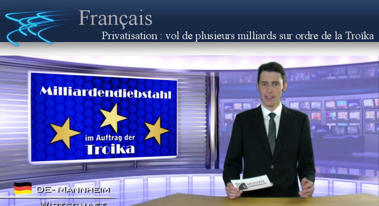 Chers téléspectateurs, une expression populaire dit : « Goutte à goutte, l’eau creuse la pierre. »L’émission d’aujourd’hui doit aussi contribuer à faire écrouler les bastions de pierre de ceux qui déstabilisent et paupérisent les peuples intentionnellement et depuis longtemps. Un exemple actuel en Europe est la privatisation : un vol de plusieurs milliards sur ordre de la Troïka. La Troïka en question se compose du Fonds Monétaire International – le FMI, de la Banque centrale européenne- la BCE et de la Commission européenne. Au début de la crise financière en 2010, elle a été mandatée pour contrôler les pays en crise au sein de l’UE, mais sans obligation de rendre des comptes au parlement. Depuis, la Troïka impose à tous les pays en crise l’obligation de vendre rapidement autant de biens que possible, et ce faisant elle ouvre aux spéculateurs un marché extrêmement rentable. Ainsi l’Etat grec a été poussé à fonder une sorte de société fiduciaire, qui vend tout largement en-dessous de sa valeur, sans aucun droit d’intervention du parlement. Tout ce qui est encore entre les mains de l’Etat est mis en vente : des plages, des bâtiments de bureaux, des immeubles, des parties d’îles, l’alimentation en eau et en courant électrique, simplement tout ce qu’on peut vendre d’une manière ou d’une autre. Cette liquidation est accompagnée de transactions sous la table, surtout quand il s’agit de projets de plusieurs milliards. Ainsi par exemple dans une vente aux enchères où il n’y avait qu’un offrant, un terrain à bâtir très recherché d’une superficie de 3 fois celle de Monaco, a été vendu pour la moitié de sa valeur estimée officielle. Et la Grèce n’est pas un cas isolé : « Dans tous les pays en crise les citoyens perdent des milliards lors de la liquidation de biens publics, qui en fait leur appartiennent à eux. » La question se pose : Quel voleur fait croire au peuple qu’il cherche à assainir les finances publiques et liquide par derrière les biens publics ? Christoph Hörstel – journaliste indépendant – l’a résumé récemment ainsi (je cite) « En dernier recours et à la dernière minute avant le crash, un système en faillite se voit obligé à commettre des vols de plusieurs milliards. » Mesdames et Messieurs, restez à l’écoute de nos émissions. Je vous dis au revoir et je vous souhaite une bonne soirée.