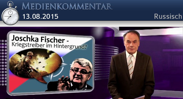 В своих сообщениях и интервью для ведущих немецких СМИ он требует «больше жёсткости» в отношении России. Бывший лидер «зелёных» предостерегает в «Южной немецкой газете»: «Давайте не будем питать иллюзий в отношении целей Владимира Путина. Он стремится как минимум к восстановлению статуса России как мировой державы». Своими аргументами Йошка Фишер специально проводит параллели с гитлеровским фашизмом и нерешительностью европейских соседей того времени. Фишер представляет Россию, как опасность для всего континента, и при этом умалчивает о том, что именно НАТО за последние 25 лет мощно расширил своё влияние в сторону России. Йошка Фишер показывает себя как закулисный подстрекатель войны, так как уже в 1999 году, находясь в должности министра иностранных дел, он, нарушая международное право, использовал боевые самолёты бундесвера для НАТО при бомбардировке Югославии. Своими выражениями он вновь показывает направление удара, которому следует американская политика с целью вбить клин между Россией и Германией. Та же самая стратегия недавно была открыто высказана Фридманом в его речи в Stratfor-е. Збигнев Бжезинский, бывший помощник президента Картера по национальной безопасности, задокументировал ключевые моменты из этой речи в своей книге „Великая шахматная доска“. Я цитирую: