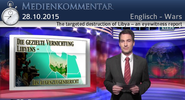 October 20, 2015 marked the 4th anniversary of the death of former head of state of Libya, Muam-mar al-Khadafi. While he fled from the NATO-bombing Khadafi was brutally murdered by rebels. Videos of his arrest show that Khadafi was abused and injured before his death. The chief prosecu-tor of the International Criminal Court in The Hague assumes that Khadafi’s death may have been a war crime. The investigations however have been hindered by the new government. Before Khada-fi’s death Libya was literally bombed to pieces by the NATO-air force for seven months. The air raids were carried out according to the resolution of the UN Security Council which accused Kha-dafi of systematic violations of human rights. More and more voices though, claim that Khadafi wasn’t deposed and Libya was not destroyed due to violations of human rights. So for example Swiss Radio and Television SRF on October 15, 2015 quoted the Algerian writer Yasmina Khadra. Khadra criticized the western powers that had sought access to a gigantic market in Libya, I quote: “Khadafi didn’t play along. Therefore they murdered him, not because he was a tyrant but because he didn’t want to share the cake.” Kla.tv reported in the broadcast on September 19, 2015 about this gigantic market and other merits of Khadafi for his country. For all other background information leading to the brutal death of Khadafi we recommend our documentary “Instrumentalizing Warfare”. Today we would like to give James and Joanne Moriarty a voice, 2 people who experienced up close - and documented - the happenings in Libya before and during the international intervention. Following this you will hear the most important excerpts from their reports about the planned and targeted destruction of Libya. James and Joanne Moriarty are a US entrepreneurial couple who was working in Libya since January 2007. They had created a unique enzyme – an organic compound – that was able to regenerate oil sources and clean pipelines and tanks. Until 2011 they had invested large sums into Libya and had begun to build up a production facility for their enzyme when in February 2011 the so-called Libyan Revolution broke out. When the NATO bombardments started, this couple was only able to leave the country under the most spectacular circumstances. They were taken in custody by bearded Al-Quaida-merceneries and were interrogated for hours. After they had handed over all of their money to the mercenaries they were released. Miraculously they finally could reach a ship and were smuggled to Bengasi in the north-east of Libya. From there they made it via airplane to Tunisia and into the USA. When they had arrived back in Texas, James Moriarty was held at the passport controls by the FBI and was interrogated for three hours. Later they learned that at this time they had already been targeted by the US-government. Joanne Moriarty: “Our crime was that we were witnesses to the war crimes and genocides that were committed in Libya by the NATO. As targeted Individuals all attempts to obtain gainful employment or restart our business that was blown up in Libya have been thwarted.” Nevertheless James and Joanne Moriarty decided that the truth about this campaign of the warmongers USA, Israel and NATO should get out to as many people as possible. Listen now to the most important excerpts of James and Joanne Moriarty’s testimony on the targeted destruction of Libya: