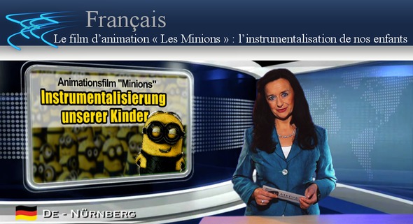 Chers téléspectateurs, le film d’animation américain en 3D « Les Minions » est donc tout à fait autre chose qu’un film anodin et drôle pour enfants. Le film « Les Minions » est utilisé comme moyen de combat tactique pour la manipulation de nos enfants ! Donc aidez-nous, s’il vous plait, à protéger nos enfants de cette influence latente et perfide contre laquelle ils ne peuvent pas encore se défendre eux-mêmes. Parlez avec vos amis, vos voisins et vos connaissances de ces liens plus profonds ! Je vous remercie.