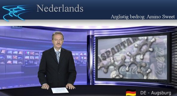 Aspartaam is een synthetische zoetstof die wordt gebruikt als additief in levensmiddelen. Na een massaal instorten van de verkoop - op grond van openbaar geworden erge risico’s voor de gezondheid - heeft men de naam veranderd in Amino Sweet. Waarom is Aspartaam zo schadelijk? Tientallen jaren geleden werd toevallig ontdekt dat een bestanddeel uit de eiwitzuren van het gifmengsel “Agent Orange”- een ontbladeringsmiddel in de oorlog van Vietnam - een zoete smaak had. De dochterfirma van Monsanto: Searl & Company, ontwikkelde zonder omwegen daaruit het zoete, zéér schadelijk levensmiddelenadditief Aspartaam. Nu heet het Amino Sweet. Geachte kijkers, wanneer zal dit systeem van multinationals, om uit alles maximale winsten te halen, ten koste van de gezondheid van veel mensen, eindelijk ophouden! Dit is niet de juiste vertaling van: Verehrte Zuschauer, wann wird diesem System der Gewinnmaximierung von Großkonzernen auf Kosten der Gesundheit vieler endlich ein Ende gesetzt. Ik wens u nog een gezonde avond... tot ziens.