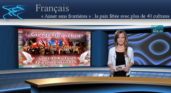 Bonsoir, il est 19h45 et nous voici de nouveau aujourd’hui avec DaN, D’autres Nouvelles, des News positives du monde entier. Le 14 mai dernier, avec la devise « Aimer sans frontières ─ amitié internationale 2016 » plus de 3 000 personnes venant de plus de 40 nations se sont rassemblées et ont posé un signe contre la division et la guerre. Des personnes issues de pays, de religions et de cultures différents se sont témoigné estime et amour mutuel dans un défilé mondial. Des extraits de vidéo, où on voit par exemple une victime de la guerre en Palestine dire à une Israélienne : « J’ai mis de côté mes expériences douloureuses et pardonné à mes ennemis », ou encore des enregistrements où on voit des Russes, des Ukrainiens et des Américains danser ensemble… Ces documents se répandent actuellement sur Internet comme une traînée de poudre et transmettent l’espoir d’un avenir sans terrorisme, sans guerre et sans souffrance… Ces derniers mois, nous avons parlé de différentes tentatives des médias principaux de fixer dans la conscience des gens l’idée que la religion est la cause de presque toutes les guerres. Ce sont des pratiques de manipulation qui ont certainement des effets destructifs. Elargissez donc aujourd’hui votre perception des choses avec Kla.tv pour voir si réellement le terrorisme a un lien avec la religion. Dans les émissions qui suivent, nous diffusons en trois parties des extraits du film de cette manifestation. 1. Un résumé de 13 minutes de cette manifestation [www.kla.tv/8441] 2. Un abrégé du discours « La matrice qui vainc » d’Ivo Sasek [www.kla.tv/8442] 3. Une diffusion intégrale du défilé mondial de l’amour, composé de participations de plus de 40 nations. [www.kla.tv/8443] Partagez, vous aussi, ces étincelles d’espoir de notre série DaN avec vos amis, votre famille et vos connaissances ! Au revoir.
