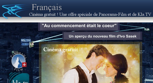 Tout le monde parle de la météo. Pas nous ! Nous parlons du cinéma gratuit. Et ceci, dès maintenant, et pendant huit semaines au moins – tout près de chez vous. Derrière une telle action, comme toujours, on trouve le fondateur de Kla.TV, Ivo Sasek. Le 25 juin il a fêté la première du film couronnée de succès avec son tout dernier long métrage « Au commencement était le cœur ». Dans ce film, on trouve beaucoup de cœur et d’amour. Jugez-en par vous-mêmes ! Car de l’action et de belles images ne vont pas changer le monde à elles seules – il faut une qualité qui va droit au cœur. Un film qui fait réfléchir ; un film qui fait rire ; et qui fait pleurer en même temps. Et une fois de plus : Rien n’est impossible, dit Ivo Sasek ; et il propose aussitôt son tout dernier film en représentation gratuite à l’écran dans des centaines de cinémas en plein air ou à domicile. Gratuit pour qui ? Evidemment pour tous les spectateurs de Kla.TV et pour tous ceux qui aimeraient faire plus ample connaissance avec nous, ou qui aimeraient même coopérer avec nous à un moment donné d’une manière ou d’une autre. Puisqu’il s’agit d’une offre spéciale internationale de Panorama-Film et de Kla.TV, il suffit de nous faire savoir dans quelle région d’Europe ou du monde vous aimeriez regarder le film, et nous vous dirigerons vers la représentation la plus proche. Inscrivez-vous maintenant en ligne sur → www.kla.tv/gratiskino ← ou bien cliquez sur le lien direct au dessous de cette émission. Alors nous vous souhaitons beaucoup de plaisir en regardant la bande-annonce de « Au commencement était le cœur » et – bien sûr – à bientôt ! Nous nous réjouissons de vous rencontrer !
