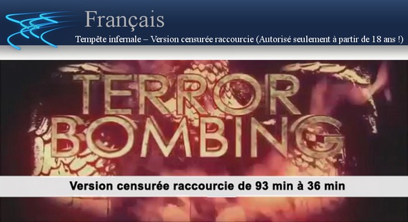 Attention : Ces extraits ne sont pas destinés aux personnes sensibles Autorisé seulement à partir de 18 ans ! Bombardement de la terreur À Version censurée raccourcie de 93 min à 36 min Pendant la Seconde Guerre mondiale l’Allemagne a été soumise à une attaque sans pitié depuis les airs. Les Américains et les Britanniques appelaient cela un « bombardement de zone » ou un « bombardement sans restriction ». Les femmes et enfants allemands qui ont vécu ce cauchemar avaient pourtant un terme plus simple, plus exact pour cela : un bombardement de la terreur. Cet acte de terreur n’était pas une erreur, c’était le plan secret du premier ministre britannique Winston Churchill et du Maréchal en Chef de l’Air Arthur Harris pour déchaîner la force de destruction maximale de la Royal Air Force contre les civils allemands, pour provoquer le plus de destruction possible, détruire le plus d’habitations possible et pour tuer le plus d’hommes, de femmes et d’enfants possible. Winston Churchill: « Les villes allemandes vont être soumises à une torture, que dans sa longueur, sa lourdeur et sa grandeur aucun pays n’a jamais subie. Et pour atteindre ce but final il n’y a aucune ampleur de la violence que nous n’allons pas appliquer.» La violence de Churchill s’est complètement dévoilée dans la nuit du 24 juillet 1943. Pour les habitants de Hambourg, une ville de plus d’un million d’âmes, il semblait tout d’abord que l’attaque aérienne était un bombardement ordinaire. Mais bientôt des centaines d’avions ennemis commencèrent à faire pleuvoir tonne après tonne des explosifs en plein cœur de Hambourg. Des écoles, des églises, des hôpitaux, des habitations, des œuvres d’art et des bâtiments historiques : tout fut réduit en miettes. La violence des attaques augmentait d’ampleur avec chaque nouvelle vague de bombardiers, laissant apparaître minute après minute, crescendo, des feux dévastateurs. Ensuite les avions disparurent soudain. Le ciel était clair à nouveau et tout, au-dessus, redevenait silencieux. Lorsque les survivants frappés de stupeur quittèrent leurs caves plus tard cette nuit-là, ils virent que leur ville autrefois si belle n’était plus qu’une ruine fumante, rougeoyante. Le jour suivant lorsque des pompiers de toute l’Allemagne du Nord combattaient l’incendie qui faisait rage, les bombardiers des Alliés réapparurent au-dessus de Hambourg. Comme planifié, les Américains ne surprirent pas seulement les forces de secours, mais aussi des colonnes entières de réfugiés. Des milliers d’entre eux perdirent la vie. Au cours de la nuit suivante, des bombardiers de la RAF revinrent. En plus de la cargaison normale d’explosifs, les Britanniques lancèrent des tonnes de bombes au phosphore pour attiser encore plus les incendies. La conflagration étendue ainsi créée provoqua une tempête de feu. Des vents de la force d’un ouragan, provoqués par la chaleur énorme, déracinaient des arbres, arrachaient des toits de bâtiments et aspiraient des victimes hurlantes dans l’enfer mugissant. Ceux qui avaient réussi à échapper aux vents de 240 km/h dans les rues, restèrent bloqués dans l’asphalte fondu et furent rapidement pris par les flammes. Ceux qui s’étaient précipités dans les canaux de la ville moururent du rayonnement thermique et, lorsque ils dérivaient à la surface de l’eau, eux aussi prirent feu. Au centre de la tempête de feu les températures atteignaient plus de 800°. Lorsque l’énorme masse de flammes se concentra, elle monta dans une colonne de feu d’une hauteur de plus de 5 km. Les attaques sur Hambourg continuèrent sans relâche encore pendant une semaine. Bientôt il ne resta plus rien à détruire. Les attaques, désignées assez opportunément par les Alliés « opération Gomorrhe », n’étaient rien d’autre que des tentatives préméditées, froidement calculées, pour éradiquer de la surface de la terre par le feu Hambourg et sa population. Le plan avait réussi. Avec 34 km2 de destruction totale, 750 000 sans-abri, 60 000 à 100 000 morts estimés, des femmes et des enfants pour la plupart, Hambourg avait pratiquement cessé d’exister. Alors il était clair que la guerre des Alliés contre l’Allemagne était devenue une guerre de la terreur et du massacre. Ce même modèle fut appliqué encore et encore à travers toute l’Allemagne. (2. Voix d’homme): Hambourg, Berlin, Nuremberg, Darmstadt, Cologne, Stuttgart, Würzburg, Munich. Toutes les villes allemandes durent endurer la même chose. Après avoir réduit une ville en ruines, les bombardiers alliés revenaient vite dans l’espoir d’attraper des survivants et des forces de secours dans les espaces découverts et pour enflammer tout ce qui restait encore avec des bombes incendiaires. Quand les bombardiers grondants jetaient leur charge mortelle, une pluie du feu se déversait sur la ville ciblée. Des milliers de petits feux s’unissaient pour former une unique mer de feu immense qui produisait un puissant tourbillon de vent et de flammes. Cate Hoffmeyer raconte (Voix de femme) : « Je luttais au milieu de la rue contre le vent. Nous ne pouvions pas la traverser parce que l’asphalte avait fondu. Il y avait là des gens sur la route, certains déjà morts, certains se trouvaient là encore vivants, mais ils étaient enlisés dans l’asphalte. Ils se trouvaient sur leurs mains et genoux et ils hurlaient. » Certains ont survécu à l’enfer comme par miracle, ayant pu se mettre en sécurité, dans des canaux, des rivières et dans des parcs. Des milliers d’autres n’ont cependant pas pu faire cela. Quand les attaques aériennes cessaient finalement et les tempêtes de feu commençaient à diminuer, les forces de secours se dépêchaient de libérer ceux qui étaient encore emprisonnés sous terre. Quand les secouristes arrivaient finalement à atteindre les abris ensevelis, ils y trouvaient