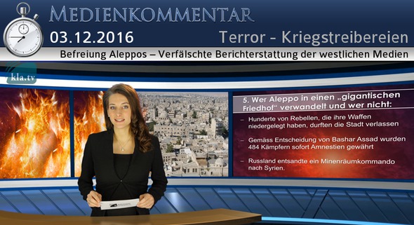 Bereits seit dem Jahr 2012 dauert der Kampf um Aleppo, zwischen den syrischen Regierungstruppen mit ihren Verbündeten und oppositionellen terroristischen Gruppierungen, an. Die deutsche Nahost-Korrespondentin Karin Leukefeld sagte kürzlich über die strategisch wichtige Stadt: „Wer Aleppo regiert, regiert auch Syrien.“ Vor gut zwei Wochen begann eine Offensive der Regierungsarmee zur Rückeroberung Ost-Aleppos. Gemäß verschiedenen Quellen sollen nun die Regierungskräfte mit Hilfe schiitischer Söldner zwischen 40 und 50 Prozent von Ost-Aleppo zurückerobert haben. So teilte der Sprecher des russischen Verteidigungsministeriums, Igor Konaschenkow, am 30. November 2016 mit, Zitat: „Die Hälfte des Territoriums in Teilen von Ost-Aleppo, das in den vergangenen Jahren von militanten Kämpfern besetzt war, wurde befreit. Was am Wichtigsten ist: es wurden 80.000 Syrer, darunter zehntausende Kinder, befreit. Viele erhielten zum ersten Mal Wasser, Nahrung, medizinische Versorgung aus russischen Zentren.“