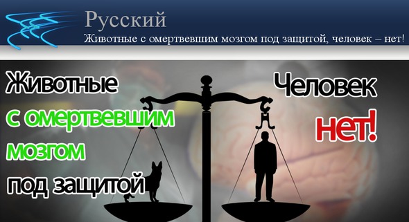 Вмешательство в живой организм животного для научно-исследовательских целей урегулировано законом о защите животных. И, таким образом, подлежит строгим законодательным предписаниям. Если нет административного разрешения, то даже операции на животных, у которых мозг вследствие глубокого наркоза окончательно повреждён, но остальные органы ещё функционируют, является наказуемым. Итак, эти животные, независимо от состояния их мозга, нуждаются в защите, так как «они ещё живые». В случае же с человеком это не так. Согласно концепции смерти мозга, человек с омертвевшим мозгом уже считается трупом и «Закон о трансплантации» регулирует лишь только изъятие, распределение u трансплантацию его органов. Человеk с омертвевшим мозгом лишён защиты, а трансплантационная медицина нацелена на то, чтобы использовать его органы для других! Поэтому необходимо заблаговременно защитится от нежелаемой трансплантации органов. Кто не желает жертвовать своими органами, должен в удостоверении о донорстве органов ответить «НЕТ» и носить его всегда при себе. Более подробную информацию вы найдёте сайтах приведенных на экране.