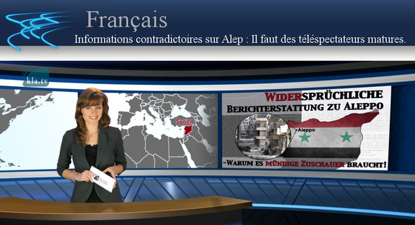 Quand il s’agit de la ville syrienne d’Alep, qui est assiégée avec acharnement depuis 2011, les reportages des médias occidentaux établis et des médias russes et syriens et alternatifs ne pourraient pas être plus différents. Pendant que les derniers quartiers d’Alep-est, qui étaient occupés par des rebelles, étaient repris par les groupes syriens gouvernementaux, la bataille médiatique entre les voix pour et contre le président syrien Bachar al-Assad s’est déchaînée une fois de plus : – Tandis que les uns se réfèrent à des informations des soi-disant rebelles et des organisations proches des rebelles, comme les Casques blancs, les autres nomment les rebelles des terroristes à cause de leur intervention brutale et ils appellent à ne pas croire la propagande de ces terroristes. La journaliste indépendante canadienne Eva Bartlett a dit des Casques blancs qu’ils prétendent être neutres, mais qu’ils portent des armes et posent pour des photos sur les cadavres des soldats syriens. – Tandis que les uns parlaient de 250 000 civils menacés par des troupes gouvernementales, les autres démentaient cette affirmation et insistaient en disant que les terroristes détenaient comme bouclier humain plus de 100 000 civils dans les quartiers est d’Alep. – Tandis que les uns parlent de l’anéantissement prévu et impitoyable des rebelles par les forces armées gouvernementales syriennes, les autres parlent d’une amnistie que le président syrien Bachar al-Assad a promulguée pour les combattants. – Tandis que les uns parlent des prétendus actes de violence envers des civils de la part de l’armée syrienne, les autres parlent d’hommes qui respirent enfin dans les régions libérées. Des hommes heureux que la situation ait changé. – Tandis que les uns disent qu’Alep est tombée, les autres parlent d’une libération et d’une reconquête d’Alep par les troupes gouvernementales syriennes. – Tandis que les uns parlent d’une « honte » et d’une catastrophe humanitaire, les autres parlent des couloirs humanitaires organisés par la Russie et la Syrie pour évacuer les gens d’Alep-est. Les gens qui ont été évacués ou réfugiés d’Alep-est seraient approvisionnés en tout ce qui est essentiel et en soins médicaux. Selon eux le gouvernement syrien, l’armée syrienne et les militaires russes apportent l’aide humanitaire dans la ville et aident les gens. : On pourrait continuer à volonté cette énumération de voix médiatiques contre et pour le président syrien : Voix pour et voix contre, déclaration contre déclaration. Chers téléspectateurs, comme Kla.TV l’a expliqué dans l’émission du 15 décembre 2016 : – considérez des accusations unilatérales avec la plus grande précaution, – écoutez la voix pour et aussi la voix contre, – et faites-vous votre propre opinion sans préjugé à l’aide de votre propre intuition. Par exemple en regardant l’émission d’informations suivante de deux minutes et demie de l’émetteur international RT, qui donne la parole aux deux voix. Pendant la dernière réunion du Conseil de sécurité de l’ONU, des nouvelles falsifiées ont provoqué des réactions émotionnelles. Divers diplomates occidentaux ont lancé des affirmations inconsistantes. (Ambassadeur britannique de l’ONU) « Cette journée est une journée très sombre pour les gens d’Alep. Sûrement la journée la plus sombre de ces 5 dernières années. Les forces d’Assad, soutenues par la Russie et l’Iran, ont donné une nouvelle définition de l’horreur. L’occupation de la ville s’est transformée en massacre. (Samantha Power ambassadrice américaine pour l’ONU) : « En ce moment, une centaine d’enfants sont enfermés dans un bâtiment qui est totalement sous les balles. Indiscutablement ce sont des terroristes... Des petits d’enfants ? Ça doit être des terroristes ! Car toutes les personnes qui sont massacrées et toutes les personnes qui sont bombardées par des bombes à fragmentations, toutes les personnes qui sont tuées par les bombes chimiques… ce sont les terroristes qui font cela. » « Notre correspondante Lisi Philen est allée dans les rues d’Alep et a montré aux habitants ce que les médias occidentaux prétendent : Qu’il y aurait juste à coté d’eux des massacres et un génocide dans la ville. » « La nuit dernière les rues d’Alep étaient remplies de gens qui fêtaient l’information selon laquelle l’armée syrienne était sur le point de reprendre toute la ville. Quand nous nous sommes réveillés ce matin, ces réjouissances n’ont pas été mentionnées dans les titres des journaux. Par contre les informations étaient remplies d’affirmations non vérifiées. Nous voulions parler de ces affirmations avec les gens d’Alep et aussi avec ceux qui ont fui Alep-est. » « Parmi les grands titres des journaux des médias occidentaux nous voyons des gros titres comme par exemple : « Des civils d’Alep disent à Al Jazira qu’un génocide les menace. » Comment réagissez-vous face à ce reportage ? » « C’est pas la vérité, la plupart des gens sont heureux que la situation ait changé, nous voulons de nouveau avoir une vie stable, tout est en ordre ici, il n’y a personne qui veut nous tuer. La situation s’améliore. » « S’il y avait un bain de sang ici, je ne serais pas là avec mes enfants. J’ai toute ma famille avec moi et nous sommes rentrés à la maison. Ici il y a ma fille qui dort paisiblement, elle n’est pas du tout dérangée. » « Personne ne nous fait de mal. Je ne donne pas raison aux médias occidentaux. Non, nous sommes pas opprimés, l’armée syrienne ne nous fait aucun mal et nous donne même de la nourriture. » « Nous avons été emmenés dans des endroits sécurisés. On nous a donné un logement, de la nourriture et tout ce dont nous avions besoin, l’armée et le gouvernement sont de notre côté. Pourquoi devraien