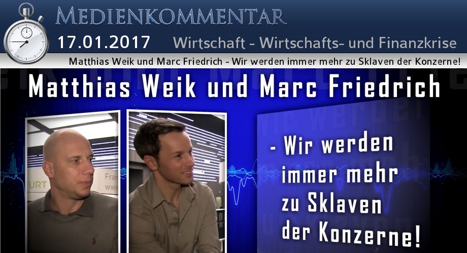 Vor einem Jahr besaßen noch 62 Superreiche so viel wie die gesamte ärmere Hälfte der Welt. Zum Beginn des Weltwirtschaftsforums (WEF) in Davos, das vom 17. - 20. Januar 2017 stattfindet, präsentierte Oxfam, ein internationaler Verbund von verschiedenen Hilfs- und Entwicklungsorganisationen, die neuesten Zahlen. Demnach sind es gerade mal noch die reichsten acht Menschen, die zusammengenommen mehr Reichtum besitzen als die ärmere Hälfte der Weltbevölkerung – insgesamt 3,6 Milliarden Menschen. Weiter kommt die Studie zum Schluss, dass das reichste Prozent der Menschheit seit 2015 mehr als der gesamte Rest der Welt besitzt. Auch reiche Länder sind laut Oxfam von sozialer Ungleichheit betroffen. In Deutschland hätten 36 Milliardäre so viel Vermögen (297 Milliarden US-Dollar) wie die ärmere Hälfte der Bevölkerung. Diese Entwicklung hänge eng mit den Möglichkeiten reicher Menschen und internationaler Konzerne zusammen, sich Vorteile auf Kosten des Allgemeinwohls zu verschaffen, kritisierte die Organisation. Sie nutzten aggressive Steuervermeidung, verschöben ihre Gewinne in Steueroasen und trieben Staaten in einen ruinösen Wettlauf um Steuersätze. Zwei Finanzexperten, die diese Entwicklung vorausgesagt und sich mit den Ursachen beschäftigt haben, das meint, dass die Reichen immer reicher werden und immer mehr bestimmen, wo es lang geht, sind die beiden deutschen Autoren Matthias Weik und Marc Friedrich. Beide studierten Betriebswirtschaftslehre und vertreten die Position, dass aufgrund des bevorstehenden Zusammenbruchs des Finanzsystems Geldanlagen zu vermeiden und in Sachanlagen zu investieren sei. In einem Interview vom Mai 2016 auf dem Frankfurter Börsenparkett fassten Weik und Friedrich die Erkenntnisse ihres neusten Buches „Kapitalfehler – Wie unser Wohlstand vernichtet wird und warum wir ein neues Wirtschaftsdenken brauchen“ zusammen. Die Katastrophe an sich sei es, dass der versprochene sogenannte Trickle-down-Effekt – also dass der Wohlstand der Reichen nach und nach durch deren Konsum und Investitionen in die unteren Schichten der Gesellschaft durchsickern würde – schlicht nicht stattfindet. Als Grund dafür sehen sie den Finanzkapitalismus, der die Vermögen total ungerecht verteilt, nur die Reichen fördert und auf Profit ausgerichtet ist. Im Gegensatz zum Finanzkapitalismus befürworten Weik und Friedrich den Realkapitalismus, weil er in Sachwerte investiert und der Produktionswirtschaft dient. Heute seien 90 % des Geldes in der Finanzwirtschaft und nicht mehr in der Realwirtschaft, was zu einer immer krasseren Kluft zwischen Arm und Reich führe. Dies seien für uns alles Warnsignale dahin, dass es kapitale Fehler am Finanzsystem sind, aus denen niemand lernen wolle. Das Problem sei das Schuldensystem, dass die Schulden immer weiter wachsen, da das Vermögen der Reichen auch wachsen müsse. Deshalb würden wir immer mehr zu Sklaven der großen Konzerne, müssten immer mehr selber machen, an den Kassen einscannen, Gebühren für alles Mögliche bezahlen, bekommen dafür aber immer weniger Gegenleistung. Friedrich wörtlich: „Irgendwann wundert sich jeder, warum er keine Zeit mehr hat ein kritisches Buch zu lesen, oder tolle YouTube-Kanäle anzuschauen, wo man informiert wird, weil wir alle noch schneller im Hamsterrad rennen müssen. Das ist vielleicht auch gewollt, weil ein uninformierter Bürger immer leichter zu regieren und zu manipulieren ist, als ein informierter.“ Hören Sie nun die wichtigsten Auszüge des Interviews mit Matthias Weik und Marc Friedrich vom Mai 2016. Informieren Sie sich und verbreiten Sie diese Zusammenhänge weiter, damit das korrupte Finanzsystem, das einzig den wenigen Reichen dient und diese noch reicher werden lässt, als solches enthüllt und von Grund auf erneuert werden kann. Marc Friedrich: Wir haben definitiv in der Recherche herausgefunden, dass die Kri-sen gewollt sind, dass das Geld immer weiter oben bei den Reichen landet und im-mer weniger nach unten im Trickledown-Effekt sich nach unten bewegt und dass die Ungerechtigkeit zwischen Arm und Reich immer größer wird. Und wir haben unglaubliche Beispiele erwähnt oder gefunden und die haben wir im Buch auch niedergeschrieben. Und dahingehend wird der Leser sehr, sehr viel erfahren und auch die Krisen verstehen – warum sie immer in Zyklen auftreten, warum sie, wie gesagt, teilweise sogar gewollt sind und warum es diese Vermögensumschichtung gibt von unten, von der Mitte, nach ganz, ganz oben. Reporterin: Ihr beschreibt darin auch, wie es zu der aktuellen Situation gekommen ist. Könnt ihr das für uns noch mal kurz zusammenfassen? Matthias Weik: Die Krise entstand, mal ganz banal gesagt, durch viel zu niedrige Zinsen und zu viel billiges Geld. Bekämpfen tun wir die die Krise heute mit historisch niedrigen Zinsen und unendlich viel billigem Geld. Aber ich kann nur noch betonen: Es wurde noch niemals in der Geschichte der Menschheit eine Krise nachhaltig durch Gelddrucken gelöst. Auch wenn wir das jetzt auf globaler Ebene versuchen, es wird nicht funktionieren. Friedrich: Im Zuge des Neoliberalismus, im Zuge der 80er Jahre hat dann Clinton oder auch Thatcher, und vor allem die rot-grüne Regierung in Deutschland in den 2000er Jahren haben die radikal den Markt dereguliert – und vor allem die Finanz-wirtschaft hat davon profitiert. Und wohin das geführt hat, sehen wir ja jetzt. 2008 war unser globales Finanzsystem mit dem Wimpernschlag vom Abgrund entfernt. Und die Finanzmärkte können sich selber nicht regulieren. Ganz im Gegenteil, sie führen von einer Krise zur nächsten Krise. Und aus diesem Grund fordern wir ganz klar – wir sind große Freunde vom Kapitalismus, von Realkapitalismus – aber der Finanzkapitalismus, der muss definitiv an die Leine genommen werden. Wir müssen antizyklisch Kapitalmarktkontrollen einführen, wir müssen die Märkte wie-der bändigen und wieder in die Bahn führen, dass sie den Menschen dienen und nicht nur sich se