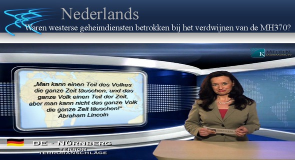 Bedankt studio Rottweil Sinds meer dan een jaar is het passagiersvliegtuig van de Malaysia Airlines vlucht MH 370, verdwenen. Het is mogelijk dat het passagiersvliegtuig boven de Maladiven voor het laatst werd gezien. Er zijn namelijk overeenkomende getuigenissen van de bewoners van een eiland van de Maladiven, die vertellen dat ze een extreem laag vliegende, witte jumbojet met rode strepen hebben gezien, wat het uiterlijk van de MH370 zeer dicht benadert. Voor de eilandbewoners was dit een bijzondere gebeurtenis, omdat volgens hen een jet nooit zo laag over hun eiland vliegt. Interessant genoeg vloog de MH370 bij de laatst vermoedelijke contacten met de Maleisische radar, ook meer in de richting van het westen, dus in de richting van Malediven, en niet in de richting van het zuiden. +++De grote zoekactie vond echter niet plaats in de nabijheid van de Maladiven, maar op grond van de gegevens van de Brits-Amerikaanse Inmarsat-satelliet-exploitant, ver weg: namelijk vóór de kust van Australië. Wilde men zo de aandacht naar een heel ander gebied leiden? De voormalige Maleisische premier Mahathir Mohamad noemde de zoekactie bij Australië verkwisting van tijd en geld. Hij beschuldigt de CIA op de hoogte te zijn van het verdwijnen van het vliegtuig. Ook de Maleisische krant Utusan Malaysia verdenkt de CIA in de zaak verwikkeld te zijn geweest. Maar zijn hier bewijzen voor? +++Een belangrijke aanwijzing in deze samenhang is dat volgens informatie van de onthullingsjournalist Gerhard Wisnewski, door het leger van de VS, precies op de dag van de verdwijning, een grote oefening in de regio georganiseerd werd. Inhoud van deze oefening was: een vliegtuig verdwijnt en moet gezocht worden. Dit wekt nog eens de herinnering aan 11 september 2001. Precies op de dag van de aanslag op het World Trade Center vond een grote militaire gevechtsoefening plaats. Inhoud van deze oefening was: terroristen kipnappen een passagiersvliegtuig om ze als een vliegende bom in een flatgebouw te sturen. Ook bij de bomaanslagen in Londen 2005 en bij Boston-marathon 2013 waren er - eigenaardig genoeg - precies op dezelfde dag oefeningen van speciale staatseenheden met precies die opdracht, zoals die zich later in werkelijkheid afspeelde. +++Bij de terreuraanslagen van Anders Breivik ontdekt men - als men nauwkeurig kijkt - precies hetzelfde grondpatroon. En ook hier werd diezelfde dag een oefening met identieke inhoud georganiseerd. Kan het echt alleen maar toeval zijn dat dergelijke oefeningen steeds met grote terreuraanslagen samenvallen? Bij dergelijke herhalingen: nauwelijks. Wisten dus de VS- militairen - ook van de MH370 - meer dan wat ze openlijk toegeven? Bij precies deze en vergelijkbare vragen laat de buitenwereld zich voortdurend afscheppen met ontevreden antwoorden en uitleg. En omdat de buitenwereld er niet op staat dat alle ongerijmdheden volledig worden opgelost, herhalen de dubieuze gebeurtenissen zich - zoals het schijnbaar spoorloos verdwijnen van een vliegtuig. Niet in de laatste plaats ook daarom, omdat onophoudelijk en ongecensureerde berichtgeving niet voor iedereen toegankelijk is. Maakt u, beste kijker, daarom iedereen opmerkzaam op onze uitzendingen. Zoals Abraham Lincoln al zei: Men kan een deel van het volk de hele tijd bedriegen, en het hele volk een deel van de tijd, maar men kan niet het hele volk de hele tijd bedriegen!