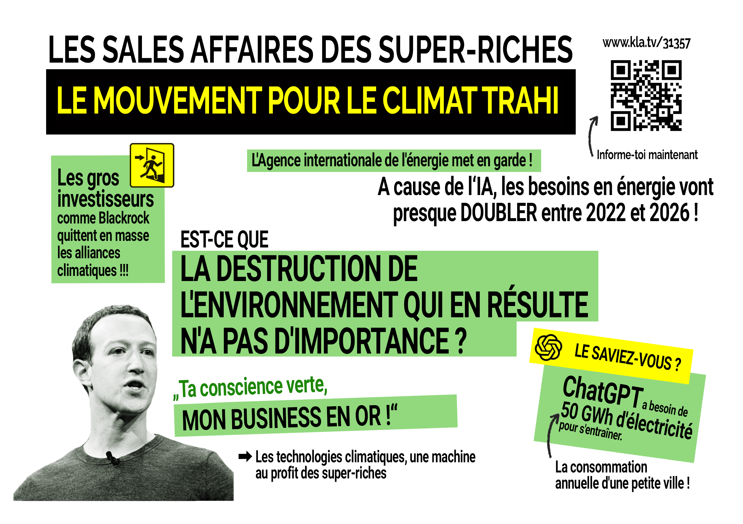 En janvier 2025, après les six principales banques américaines, c'est au tour du plus grand groupe financier du monde, BlackRock, de se retirer de l'alliance climatique Net Zero. La plus puissante banque centrale, la Réserve fédérale, ou FED, a quitté le "réseau du système financier vert". Dans le même temps, le nouveau président américain Trump a annoncé qu'il comptait à nouveau miser entièrement sur les combustibles fossiles. Donald Trump : "Drill, baby, drill". ["Fais des forages, chérie !"] Face aux phénomènes météorologiques extrêmes, de nombreux jeunes s'engagent dans des mouvements en faveur du climat comme Fridays for Future ou Extinction Rebellion. A vos yeux, le retrait des grands investisseurs ressemble sans doute à une gifle. Pour mieux situer les événements actuels, jetons d'abord un coup d'œil sur la genèse des mouvements de protection du climat. 1. Genèse du mouvement pour le climat En 2006, l'homme politique et chef d'entreprise américain Al Gore a confronté pour la première fois l'opinion publique mondiale avec le film : "Une vérité qui dérange". Celui-ci dessine un scénario de fin du monde dû à un réchauffement climatique d'origine humaine. Gore est multimillionnaire et a été le 45e vice-président des États-Unis sous la présidence de Bill Clinton. Al Gore a prédit en juillet 2008 : "Notre trajectoire actuelle n'est pas du tout durable. Les scientifiques du monde entier [...] nous disent qu'il nous reste peut-être moins de dix ans pour apporter des changements spectaculaires afin d'éviter les effets catastrophiques de la crise climatique. [...] Et la seule façon de prendre ses responsabilités est de s'attaquer à la racine du problème, à savoir la combustion des combustibles fossiles." Dès lors, toute l'attention s'est portée sur la réduction des émissions de CO2 comme cause de tous les maux. Les dépenses en publicité de Gore pour convaincre le public sont estimées à 300 millions de dollars pour la seule année 2009. Al Gore, par exemple, a créé des organisations qui ont formé des "leaders climatiques". Des mouvements tels que Fridays for Future ou Extinction Rebellion ont alors vu le jour. Des idoles comme Greta Thunberg, Luisa Neubauer et Alexandria Ocasio-Cortez ont été encouragées de manière ciblée et un grand réseau en faveur du climat a été mis en place. 2. Les nouvelles technologies comme modèle économique des super-riches Dans l'opinion publique, ce sont précisément ces militants comme Greta Thunberg qui ont fait pression sur les politiques par des protestations très médiatisées. Mais ce que perçoit le public, est-ce la réalité ? Des années avant la première apparition publique de Greta Thunberg, la Banque mondiale et le FEM posaient déjà les jalons d'une nouvelle "politique climatique". Des années avant le début des protestations en faveur du climat, les géants de la finance ont commencé à investir des centaines de milliards de futurs fonds d'investissement dans des "entreprises pro-climat" souvent sans valeur, et à développer les capacités de production. Ils ont ainsi acquis une position de leaders sur le marché et étaient prêts à conclure de gros contrats. Étonnamment, peu de temps après la première apparition médiatique de Greta lors de la grève scolaire d'août 2018, le monde politique a commencé à s'activer. Par exemple, dès le 17 octobre 2018, Juncker, alors chef de l'UE, a signé un protocole d'accord avec le fonds d'investissement pour les "énergies propres" Breakthrough Energy Europe. Enveloppe de départ : 100 millions d'euros. Les entreprises membres super-riches devaient ainsi bénéficier d'un accès privilégié aux financements de l'UE. Le fondateur du fonds d'investissement Breakthrough Energy est Bill Gates. Parmi ses membres, on trouve des super-riches comme Mark Zuckerberg de Facebook, Julian Robertson du géant de fonds spéculatifs Tiger Management, David Rubenstein, le fondateur de Carlyle Group, George Soros, Jack Ma d'Alibaba, etc. Le marché des "technologies climatiques" a été constamment élargi par l'UE. En février 2019, Juncker a proposé de consacrer un euro sur quatre du budget de l'UE à l'atténuation du changement climatique entre 2022 et 2027. On a l'impression que la politique, par sa législation, a ouvert un marché très rentable pour les "technologies climatiques" des grands acteurs. Ceux-ci ont bénéficié d'une double chance de gagner. Ils ont pu profiter des subventions de l'UE et de la forte demande pour leurs produits. Les États sont fortement poussés par l'UE à répondre à cette demande, car des technologies telles que l'énergie éolienne, l'énergie solaire ou l'e-mobilité sont promues de manière offensive. Des termes comme "empreinte écologique" ou "bilan carbone" reflètent le fait que le CO2 est devenu la mesure de toute chose. Pour simplifier, le "CO2" est devenu une sorte de nouvelle monnaie sur les marchés boursiers. Dès le début, l'accent a été mis entièrement sur la réduction du CO2, seul responsable de presque tous les problèmes météorologiques. Pas d'intempéries sans les mêmes gros titres : "C'est la faute au changement climatique ! Nous devons réduire le CO2 !" On reste sceptique devant le fait que d'autres causes ne soient même pas envisagées pour les inondations et les incendies réellement dévastateurs. Pire encore, les voix des scientifiques et des experts qui remettent en question le récit public n'ont aucune chance d'être médiatisées. Il existe par exemple d'innombrables brevets qui révèlent la facilité avec laquelle les catastrophes météorologiques peuvent être générées de nos jours. De même, la destruction de l'environnement, comme la déforestation pour l'extraction de matières premières rentables ou le développement de parcs éoliens, n'est guère abordée. Une orientation unilatérale vers un "changement climatique" uniquement dû au CO2 occulte pres