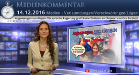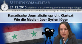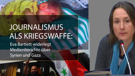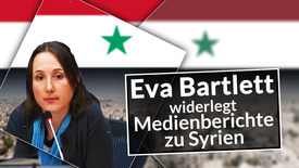 Eva Bartlett ist eine unabhängige kanadische Journalistin. Sie untersucht die Hintergründe für die fragwürdigen Darstellungen zu den Kriegseinsätzen in Nahost. Sie übt deutliche Kritik an der Rolle der Medien. Aus ihrer Sicht klebt das Blut der Zivilisten an den Händen der Medienschaffenden, denn durch Kriegspropaganda haben diese das Leiden der Bevölkerung verlängert.