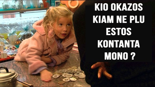 Kio okazos kiam ne plu estos kontanta mono ? Montru al mi vian manon ! Vi povas diri al Panjo, ke ŝi nepre metigu al vi elektronikan blaton. Ĝis revido ! Kion vi volas ? Ĉu mi povas havi iom da lakto ? Nuntempe, oni ne plu povas fari tion… tute malbone. Bovineto, ĉu vi donos al mi iom da lakto ? Ne estu tia, la estonteco de niaj infanoj. Haltigu la elektronikan blaton !