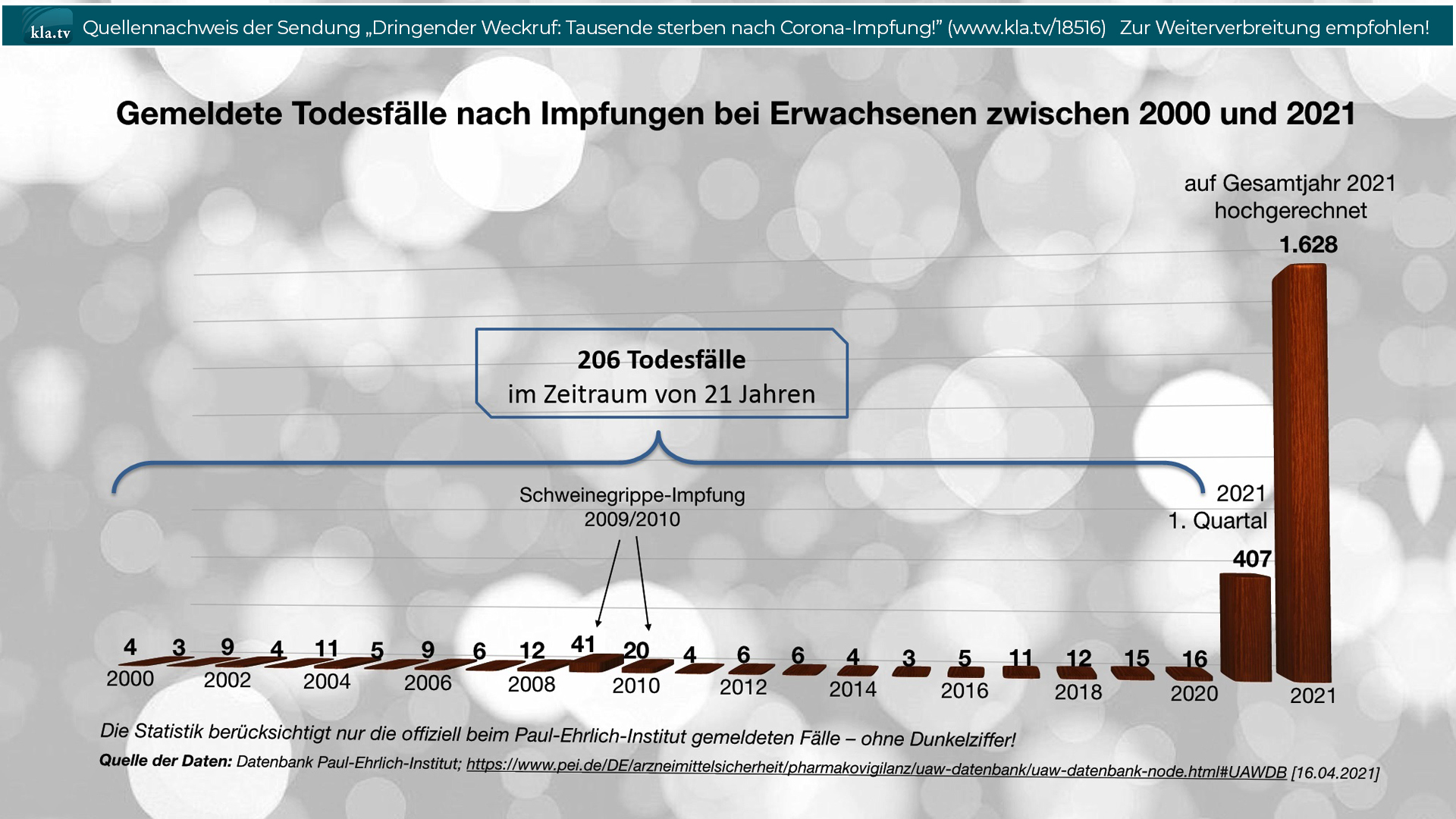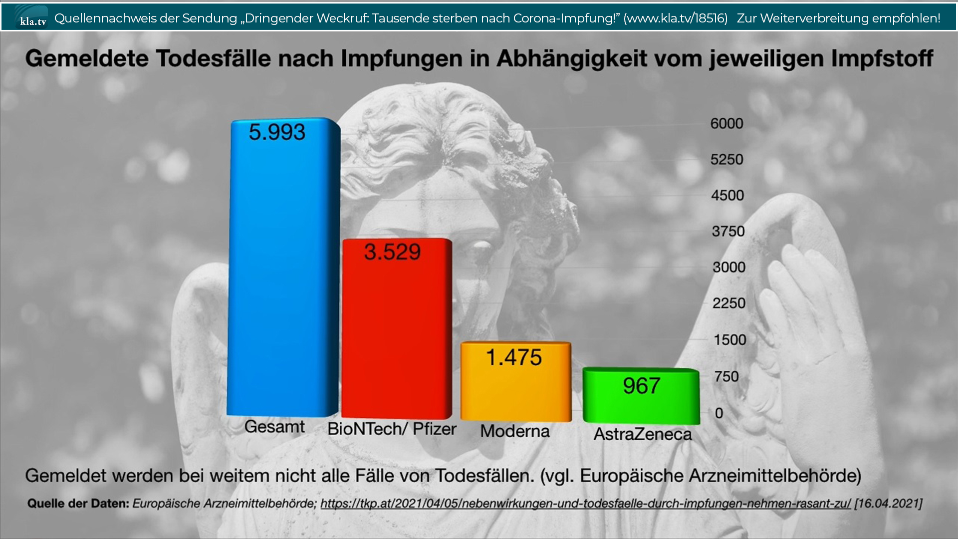 Schlagzeilen wie „Wann zündet der Impfturbo?“, „Impfquote steigt“ oder „Hausärzte sollen endlich impfen“ bestimmen seit Monaten die Titelseiten sogenannter Leitmedien. Nach dem Willen der Bundeskanzlerin Angela Merkel sollen möglichst schnell alle Menschen auf der Welt gegen Corona geimpft werden! Wörtlich sagte sie: „Die Pandemie ist erst besiegt, wenn alle Menschen auf der Welt geimpft sind.“ Hierfür wurden in einer Rekordzeit von weniger als 12 Monaten neuartige Impfstoffe entwickelt. Zuvor waren die Impfstoffhersteller über 20 Jahre mit mRNA-Impfstoffen in Tierversuchen kläglich gescheitert. Hier stellt sich doch unausweichlich die Frage: Werden die Tierversuche nun am Menschen durchgeführt? Denn nur über ein verkürztes Zulassungsverfahren hat die Europäische Arzneimittelbehörde (EMA) diese Impfstoffe für den Menschen bedingt zugelassen. Während alternative Medienplattformen kritisch über diese neuen Corona-Impfungen berichteten, glich die Suche nach impfkritischen Beiträgen in den sogenannten Leitmedien der Suche nach der berühmten Stecknadel im Heuhaufen! Die Impfungen wurden als alternativlos dargestellt und warnende Stimmen wurden und werden immer noch ignoriert, diffamiert oder sogar zensiert. Neben vielen weiteren hochkarätigen Experten kam in den „Alternativmedien“ auch Dr. Sucharit Bhakdi zu Wort. Bhakdi ist emeritierter Professor für Medizinische Mikrobiologie und Immunologie und ehemaliger Lehrstuhlinhaber am Institut für Medizinische Mikrobiologie und Hygiene der Johannes Gutenberg-Universität zu Mainz. Er warnte zusammen mit 12 anderen prominenten Wissenschaftlern und Ärzten bereits vor Monaten eindringlich vor der Gefahr, dass Corona-Impfungen Blutgerinnsel hervorrufen können. Diese Warnung hat sich nun in der realen Impfpraxis durch aufgetretene Todesfälle nach Corona-Impfungen nachweislich bestätigt! Wir ziehen deshalb in dieser Sendung Bilanz über drei Monate „Corona-Impfpraxis“. Grundlage für diesen „Praxistest“ sind veröffentlichte Zahlen und Fakten aus Tageszeitungsberichten, die wir als Quelle nennen, ergänzende Quellen finden Sie auf unserer Homepage www.kla.tv als Dokument im Sendungstext. Teil 1: Die Dokumentation tragischer Todesfälle nach Corona-Impfungen I. Was unmittelbar nach den Corona-Impfungen in deutschen Alten- und Pflegeheimen geschah: Die Übersicht über Seniorenheime mit mindestens 5 Todesfällen nach Corona-Impfung (1. Quartal 2021) finden Sie hier: [https://www.kla.tv/_downloads/download.klagemauer.tv/2021/20210413_MK_WeckrufCoronaImpfung_DOKUMENT_1_v09_END.pdf] Weitere erschütternde Meldungen nach Impfungen in deutschen Alten- und Pflegeheimen: Die Übersicht über Corona-Ausbrüche nach Corona-Impfung in Seniorenheimen mit bis zu 4 Todesfällen (1. Quartal 2021) finden Sie hier: [https://www.kla.tv/_downloads/download.klagemauer.tv/2021/20210415_MK_WeckrufCoronaImpfung_DOKUMENT_2_v13_END.pdf] Das schockierende FAZIT der „Corona-Impfpraxis“ in Alten- und Pflegeheimen: FAZIT 1: Unmittelbar NACH den Impfungen kam es zu insgesamt 3.298 „Infektionen“! Diese wurden allein aus den dokumentierten Presseartikeln entnommen – die Dunkelziffer dürfte um ein Vielfaches höher sein. Zuvor gab es jeweils nur einzelne Erkrankungen. Die Faktenlage lässt bei objektiver Betrachtung nur den Schluss zu, dass die Impfungen die Corona-Erkrankungen nicht verhindern konnten, vermutlich sogar ausgelöst haben. FAZIT 2: Unmittelbar NACH den Impfungen kam es zu insgesamt 324 Todesfällen! Diese wurden ebenfalls allein aus den dokumentierten Presseartikeln entnommen. Mitarbeiter der Altenheime bestätigen, dass die Senioren vor der Impfung völlig unauffällig waren, aber kurz danach unerwartet verstarben. Aufgrund der unglaublichen Häufung von Todesfällen in den Heimen ist es völlig abwegig, den ursächlichen Zusammenhang zwischen den Impfungen und den Todesfällen abzustreiten. Dies widerspricht auch jeder mathematischen Wahrscheinlichkeitsrechnung. Eine sehr plausible Erklärung für das massenhafte Seniorensterben liefert Professor Bhakdi : „Diese Impfung gehört vor ein Tribunal. Sie ist nicht ausreichend geprüft. Die Lymphozyten fallen die von der Impfung befallenen Zellen an. Kopfschmerzen, Fieber, Muskelschmerzen usw. sind die Folge. Wenn Sie vorerkrankt sind, kann das der Tropfen auf den heißen Stein sein. Kommt dann ein anderes Coronavirus, haben Sie voraktivierte Lymphozyten. Wenn diese über Ihre Lunge herfallen, nennt man das immunbedingte Verstärkung eines Krankheitsverlaufes. Dieses Phänomen ist bekannt. Man hört aus Pflegeheimen, dass Menschen nach der Impfung an Covid 19 gestorben sind. Zufall? Das ist ein unethischer Menschenversuch, der vor ein Tribunal gehört.“ Diese „Impfkatastrophe“ wird auch anhand erschreckender offizieller Zahlen des Paul-Ehrlich-Institutes – kurz PEI – deutlich. Das PEI ist das deutsche Bundesinstitut für Impfstoffe und biomedizinische Arzneimittel und als Bundesoberbehörde für die Sicherheit von Impfstoffen verantwortlich. In der Datenbank des Paul-Ehrlich-Instituts sind für den Zeitraum vom 1.1.2000 bis 31.12.2020 für ALLE Impfungen – also von Tetanus über Diphterie bis zur Grippeimpfung – bei Erwachsenen insgesamt 206 Todesfälle registriert. Der aktuelle Sicherheitsbericht des Paul-Ehrlich-Instituts weist seit Beginn der Corona-Impfungen bis einschließlich 2. April bereits 407 Todesfälle allein nach den Corona-Impfungen aus. Zum Vergleich: Rechnet man das erste Quartal auf das Gesamtjahr 2021 hoch, ergäben sich rechnerisch 1628 Todesfälle nach der Corona-Impfung. Diese Grafik wurde aus offiziell veröffentlichten Zahlen des PEI erstellt. Sie belegt unmissverständlich eine im Vergleich zu den Vorjahren weit über hundertfach erhöhte Sterblichkeit nach Impfungen seit Beginn der Corona-Impfungen. Warum hat das PEI als oberste Sicherheitsbehörde aufgrund dieser alarmierenden Datenlage nicht längst Alarm geschlagen? Laut e