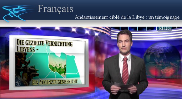 Le 20 octobre 2015 cela a fait 4 ans que l’ancien chef d’état Mouammar Kadhafi est mort. A la suite des bombardements de l’OTAN, Kadhafi a été brutalement assassiné par des rebelles. La vidéo de son arrestation montre que Kadhafi a été maltraité et blessé avant sa mort. Le procureur général de la cour de justice internationale de la Haye estime que la mort de Kadhafi pourrait être un crime de guerre. Les investigations ont pourtant été empêchées par le nouveau gouvernement. Avant la mort de Kadhafi la Libye a véritablement été détruite par les bombardements de l’armée de l’OTAN pendant 7 mois. Les attaques aériennes ont eu lieu sur décision du conseil de sécurité de l’ONU, qui accusait Kadhafi de violation systématique des droits de l’homme. Maintenant pourtant, de plus en plus de voix s’élèvent en affirmant que ce n’est pas à cause de violations des droits de l’homme que Kadhafi a été destitué et la Libye détruite. Ainsi par exemple le 15 octobre 2015, la radio-télévision suisse SRF cite l’auteur algérien Yasmina Khadra. Khadra critique les forces occidentales, qui auraient cherché un accès à un gigantesque marché en Libye, je cite : « Kadhafi n’a pas joué le jeu. C’est pourquoi ils l’ont tué, pas parce que c’était un tyran, mais parce qu’il ne voulait pas partager le gâteau. » KlaTV a parlé de ce gigantesque marché et des autres mérites de Kadhafi pour son pays dans l’émission du 24 septembre 2015 (6772). Pour plus d’informations sur les raisons qui ont mené à la mort brutale de Kadhafi, nous conseillons le film documentaire « Guerre par instrumentalisation ». Dans l’émission d’aujourd’hui nous aimerions donner la parole à deux personnes qui ont vécu de très près et analysé les événements en Libye, avant et pendant l’intervention internationale : James et Joanne Moriarty. Vous entendrez à la suite les extraits les plus importants de leur rapport sur la destruction planifiée et ciblée de la Libye. James et Joanne Moriarty sont un couple d’entrepreneurs américains, qui travaillaient en Libye depuis janvier 2007. Ils avaient fabriqué une enzyme unique, c’est-à-dire une liaison organique, qui peut régénérer des puits de pétrole et nettoyer les conduits et les réservoirs. Jusqu’en 2011 ils avaient investi des sommes énormes en Libye et avaient commencé à construire un site de production pour leur enzyme, jusqu’à ce qu’éclate en février 2011 la prétendue révolution libyenne. Lorsque les bombardements de l’OTAN ont commencé, le couple n’a réussi à sortir du pays que dans des conditions extraordinaires. Ils ont été retenus par des mercenaires barbus d’Al-Qaïda et interrogés pendant des heures. Ils ont dû donner tout leur argent aux mercenaires, et seulement après, ils ont été relâchés. Comme par miracle, ils ont finalement réussi à monter sur un bateau et ont été amenés clandestinement au Benghazi au Nord-Ouest de la Libye. De là ils ont réussi à prendre l’avion pour la Tunisie puis pour les Etats-Unis. De retour au Texas, lors du contrôle des passeports, James Moriarty a été arrêté par le FBI et interrogé pendant trois heures. Plus tard, ils ont appris qu’ils étaient déjà surveillés par le gouvernement américain. Joanne Moriarty raconte : « Notre crime consistait dans le fait que nous avions été les témoins des crimes de guerre et des meurtres de masses qui ont été commis en Libye par l’OTAN. En tant que personnes ciblées par le gouvernement, toutes nos tentatives pour obtenir un emploi convenable ou pour reconstruire notre commerce détruit en Libye ont été contrecarrées. » James et Joanne Moriarty ont néanmoins décidé que le plus grand nombre de personnes possible devaient apprendre la vérité sur cette campagne des bellicistes que sont les Etats-Unis, Israël et l’OTAN. Ecoutez à présent vous-même les extraits les plus importants du témoignage de James et Joanne Moriarty sur l’anéantissement ciblé de la Libye : « J’aimerais souligner que le peuple libyen ne consistait en aucun cas de musulmans extrémistes. La partie du Coran qui parle de tuer des non-croyants a été bannie de la Libye par Kadhafi. Il était d’avis que ce n’est pas une véritable partie du Coran. C’est pourquoi une Fatwa, un ordre de mise à mort, était décidé contre Kadhafi depuis 20 ans par des musulmans radicaux extrémistes. Toutes les religions du livre étaient autorisées en Libye. Dans les années 70 Kadhafi a permis aux femmes de s’émanciper. Aucune tenue spécifique n’était prescrite et toutes les femmes avaient accès à une éducation de grande qualité si elles le désiraient. Il y avait des femmes médecins, des avocates, des ministres, des femmes d’affaires et aussi des femmes au foyer normales, bref, ce qu’elles choisissaient. […] » « Le peuple libyen était heureux, il n’avait presque pas d’impôt; même les entreprises n’étaient taxées qu’au minimum. Le gouvernement partageait la prospérité libyenne avec les gens et ne prélevait pas d’impôts sur des personnes privées pour soutenir l’Etat. Il n’y avait aucune raison pour une révolution, seuls quelques islamistes radicaux mécontents essayaient d’imposer en Libye la charia, c’est-à-dire le droit islamique général en vigueur. Mais cela sans aucun succès, car ils représentent seulement 3 à 5% de la population. Ce sont ces gens-là qui se sont alliés avec l’OTAN et les Etats-Unis pour prendre le pouvoir en Libye. Nous avons passé beaucoup de temps avec les tribus libyennes, pour connaître la vérité sur la Libye et son gouvernement. Nous avons aussi été témoins des indicibles crimes de guerre qui ont été commis par l’OTAN contre des personnes innocentes en Libye. « Comme le peuple ne soutenait pas la soi-disant révolution en Libye, l’OTAN, les Etats-Unis, le Royaume-Uni, la France, l
