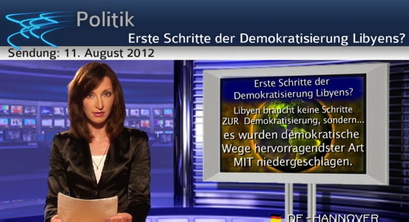 Radio DRS 1 meldete am 3.7.2012 in den Acht-Uhr-Nachrichten, dass nebst heftigen Demonstrationen und einem heillosen Durcheinander in Libyen dennoch endlich erste kleine Schritte in der Demokratisierung Libyens stattfänden. Verweisend auf eine ziemlich diffus und unkoordiniert wirkende Plakat-Aktion wurde wiederholt betont, dass es sich wirklich erst um einen ganz kleinen ersten Schritt handle. In dem „Grünen Buch“ von Muammar Al Gaddafi geht jedoch schon aus dem 1. Kapitel „Die Macht des Volkes“ klar und deutlich hervor, dass mit der Niederschlagung Libyens gleichzeitig ausgefeilt demokratische Wege hervorragendster Art mit niedergeschlagen wurden. Selbst die Schweiz könnte sich alle Finger ablecken, hätte sie auch nur einen Bruchteil jener Qualität von Demokratie erlangt, wie sie Muammar Al Gaddafi in Tat und Wahrheit propagierte und nicht bloβ in ersten kleinen Schritten, sondern der praktischen Vollendung nahe, vorantrieb. Wer das nicht glaubt, lese einfach sein „Grünes Buch“ oder orientiere sich an den über 200 Königen von Afrika, die Gaddafi deswegen kurz vor seiner Ermordung zum König der Könige von Afrika gekürt haben. Amnesty International hatte Muammar Al Gaddafi noch kurz vor seinem Niedergeschlagenwerden zum überragenden Menschenrechtshelden des Jahres 2011 nominiert.