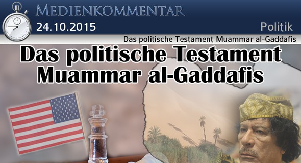Über den gewaltsamen Tod des ehemaligen Staatsoberhaupts von Libyen, Muammar al-Gaddafi, und die Hintergründe, die dazu führten, berichteten wir in der Sendung vom 22. Oktober 2015 – „Die gezielte Vernichtung Libyens – ein Augenzeugenbericht“. Auch empfehlen wir Ihnen unseren Dokumentarfilm „Instrumentalisierende Kriegsführung – Flüchtlinge als Kriegswaffe?!“. Dieser zeigt detailliert auf, wie die gezielte Beseitigung Gaddafis und die Zerstörung Libyens nichts anders als ein geschickter Spielzug in einem weit umfassenderen Plan einiger weniger Globalstrategen war. Diese „weltumspannenden Spieler“ haben es im Falle Libyens einmal mehr geschafft, ihr immer gleiches Ziel voranzutreiben: Die Totalschwächung und Destabilisierung Europas und der ganzen noch nicht amerikanisierten Welt. Anhand unkontrollierbarer Flüchtlingsströme soll Europa destabilisiert werden und im Sumpf zunehmender sozialer, wirtschaftlicher, politischer, aber auch religiöser Probleme versinken. Strategisches Ziel dahinter ist die totale Erschöpfung der Nationen und als Folge davon, deren willige Einreihung in die Neue-Welt-Ordnung der globalen Drahtzieher. Und genau dazu wären die Nationalstaaten Europas ohne das bewusst orchestrierte Chaos nie bereit gewesen. Heute jedoch wollen wir Muammar al-Gaddafi selber zu Wort kommen lassen, der genau dieses Spiel der wenigen Globalstrategen durchschaut zu haben schien. Gaddafi entlarvte das amerikanische Verständnis von scheinbarer „Demokratie“ und „Freiheit“, das er ein „Halsabschneider-System“ nannte, in dem der größte Hund den Rest auffrisst. Anderseits tat Gaddafi alles was er konnte, um das Konzept wahrer Demokratie zu verstehen und in Libyen zu praktizieren. Doch hören Sie selbst: In einem ersten Ausschnitt die düstere Prophezeiung, die der ehemalige libysche Anführer einige Monate vor seinem Tod in Bezug auf die Flüchtlingsströme nach Europa in einem offenen Brief schrieb. Diese wurde von der russischen Tageszeitung Zavtra im Mai 2011 publiziert. Anschließend hören Sie ungekürzt das sogenannte „Politische Testament Muammar al-Gaddafis“ – das er am 5. April 2011 verfasst hat. Beides erschien, nachdem am 19. März 2011 die Luftangriffe der NATO begonnen hatten und Libyen systematisch zerbombt wurde. „Hört zu, Völker der NATO! Ihr bombardiert eine Mauer, die den Weg der afrikanischen Migration nach Europa und den Weg der Terroristen von al-Qaida versperrt hat. Diese Mauer war Libyen. Ihr Idioten reißt sie nieder, und ihr werdet in der Hölle schmoren für Tausende Migranten aus Afrika und weil ihr al-Qaida unterstützt habt. So wird es sein, und ich lüge nie. Und ich lüge auch jetzt nicht.“ "Erinnerungen an mein Leben: Oberst Muammar Gaddafi, der Führer der Revolution – 5. April 2011. Im Namen Allahs, des Wohltätigen, des Barmherzigen … Während 40 Jahren, oder waren es mehr, ich erinnere mich nicht, tat ich alles, um den Leuten Behausungen, Spitäler, Schulen und, wenn sie hungrig waren, Nahrung zu geben. In Bengasi machte ich sogar Agrarland aus der Wüste, ich setzte mich gegen die Angriffe von diesem Cowboy Reagan durch, als er meine adoptierte verwaiste Tochter tötete. Er hatte versucht, mich zu töten. Stattdessen tötete er dieses arme unschuldige Kind. Dann half ich meinen Brüdern und Schwestern in Afrika mit Geld für die Afrikanische Union. Ich tat alles, was ich konnte, um den Leuten zu helfen, das Konzept wahrer Demokratie zu verstehen, in der Volksausschüsse unser Land führen. Aber, wie mir gesagt wurde, war dies alles nicht genug. Sogar Menschen, die Häuser mit zehn Zimmern hatten, neue Anzüge und neue Möbel, waren niemals zufrieden. Selbstsüchtig wie sie waren, wollten sie mehr. Amerikanern und anderen Besuchern erzählten sie, dass sie „Demokratie“ und „Freiheit“ bräuchten, ohne zu erkennen, dass es sich dabei um ein Halsabschneider-System handelt, in dem der größte Hund den Rest auffrisst. Doch sie waren von diesen Worten verzaubert, ohne zu erkennen, dass es in Amerika keine kostenlose Medizin gab, keine kostenlosen Spitäler, keine kostenlosen Häuser, keine kostenlose Ausbildung und keine kostenlose Nahrung, von Leuten die bettelten abgesehen oder den langen Schlangen für einen Teller Suppe. Nein, was immer ich auch tat, für einige war es nie genug. Doch andere, die wussten, dass ich der Sohn von Gamal Abdel Nasser war, der einzige wahre arabische und muslimische Führer, den wir seit Saladin hatten. Als er den Suez-Kanal für sein Volk beanspruchte, so wie ich Libyen für mein Volk beanspruchte, waren es seine Fußspuren, denen ich zu folgen versuchte, um mein Volk vor Kolonialherrschaft zu schützen – vor Dieben, die von uns stehlen würden. Nun stehe ich unter dem Angriff der größten Macht in der Militärgeschichte. Mein kleiner afrikanischer Sohn Obama möchte mich töten, um unserem Land die Freiheit zu nehmen, um uns unsere kostenlosen Behausungen zu nehmen, unsere kostenlose Medizin, kostenlose Ausbildung, kostenlose Nahrung, um es durch Diebstahl im amerikanischen Stil zu ersetzen, der „Kapitalismus“ genannt wird. Doch alle von uns in der Dritten Welt wissen, was das bedeutet. Es bedeutet, dass Konzerne das Land führen, die Welt führen, und dass die Menschen leiden. Somit gibt es keine Alternative für mich. Ich muss meinen Platz einnehmen. Und wenn Allah es wünscht, werde ich sterben, indem ich seinem Pfad folge, jenem Pfad, der unser Land reich an Agrarland sowie mit Nahrung und Gesundheit gemacht hat, und uns sogar erlaubt, unseren afrikanischen und arabischen Brüdern zu helfen, indem sie hier mit uns arbeiteten, in der libyschen Volksrepublik. Es ist nicht mein Wunsch, zu sterben. Doch wenn es so weit kommen sollte, um dieses Land zu retten, mein Volk, all die Tausende, die meine Kinder sind, dann möge es geschehen. Soll dieses mein Testament, meine Stimme an die Welt sein, dass ich mich gegen die Kreuzzugsattacken der NATO erhoben habe, 