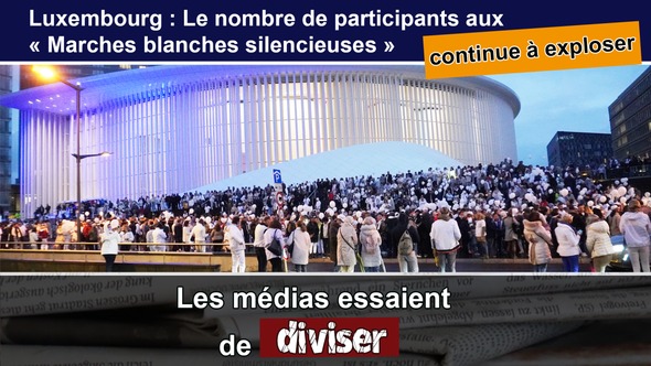 Récemment, nous avons parlé sur Kla.TV de l'augmentation du nombre de participants à la 2ème Marche blanche silencieuse au Luxembourg, par rapport à la 1ère Marche blanche [www.kla.tv/20126]. Ces marches silencieuses ont lieu en signe de protestation contre les mesures restrictives de Covid. Lorsque la 3e Marche blanche a eu lieu le 15 octobre, l'intérêt de la population était grand. L'atmosphère de la Marche blanche silencieuse était joyeuse, pacifique et pleine d'espoir. L'unité entre les participants était palpable dans l'air. Il s'agit là d'un signe important pour le petit Luxembourg, qui ne pouvait plus être ignoré, et les médias luxembourgeois en ont donc également parlé abondamment. Même le nombre de participants qui était d'environ 4 000 personnes a été rapporté par les médias et la police à l'unisson, - ce qui signifie 3 fois plus que lors de la deuxième marche. Étant donné que la minimisation du nombre de participants, comme lors de la première marche silencieuse, n'a manifestement plus fonctionné, les divers médias de masse se sont mis à diffamer les participants et à vouloir les diviser. Par exemple, dans une interview du député Fernand Kartheiser, qui a une attitude positive à l'égard des marches silencieuses, RTL a demandé que les militants de la Marche blanche se distancient des théoriciens du complot. Pendant ce temps, le "Tageblatt", le deuxième plus grand quotidien du Luxembourg, titrait son reportage sur la 3e Marche blanche silencieuse par "Le pire virus". D'une part, ils n'ont pu éviter d'écrire dans leur rapport qu'un esprit d'optimisme était palpable et que de nombreux citoyens concernés avaient rejoint la marche de protestation. En revanche, le Tageblatt a vivement attaqué les participants à la marche et a utilisé à plusieurs reprises des mots-clés diffamatoires tels que « négationnistes radicaux du covid », « populistes", « théoriciens du complot », « opposants radicaux à la vaccination ». Il est frappant de constater que ces termes sont souvent répétés : ils étaient manifestement destinés à ce que les lecteurs les relient à la marche blanche silencieuse. Mais on se demande comment les médias savent exactement qui est un populiste, un théoricien du complot, etc. lors de ces marches silencieuses - car aucun discours n'a été prononcé. Les organisateurs avaient également précisé à l'avance qu'il ne s'agissait pas d'une manifestation et avaient même demandé aux gens de ne pas porter de messages sur des banderoles, des T-shirts et des pancartes, mais simplement d'apparaître en blanc. Même sur place, il a été demandé aux personnes qui avaient des affiches de ne pas les brandir. Ce qui a été accepté sans problème. Il était donc impossible pour les médias de tirer des conclusions sur les intentions d'une grande partie des participants. Des déclarations comme celle du Tageblatt, selon laquelle « il y avait de nombreux opposants à la vaccination et des négationnistes radicaux du Covid » sont donc totalement infondées. Le but de ces insinuations est évidemment de suggérer aux lecteurs que des personnes peu fréquentables assistent aux marches blanches et qu'il vaut mieux ne rien avoir affaire avec eux. L'objectif est probablement d'arrêter l'afflux continu de personnes aux marches blanches, de détruire l'unité perceptible parmi les participants et de les diviser en groupes qui se rejettent mutuellement. Il reste à espérer que les Luxembourgeois ne se laisseront pas prendre par les tentatives des grands médias de les diviser, mais qu'ils se rendront en plus grand nombre à la 4e Marche blanche silencieuse du 29 octobre pour envoyer un signal contre ces mesures coercitives de plus en plus dures. Ceux qui hésitent encore à participer à cet événement au vu des reportages incendiaires des médias peuvent avoir un petit aperçu de l'atmosphère de ces marches silencieuses dans le résumé suivant de la 3e « Marche blanche silencieuse ».