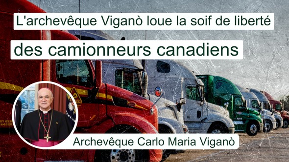 Dans un message adressé aux camionneurs canadiens, l'archevêque Viganò, investigateur et visionnaire, loue leur soif de liberté. Il s'exprime comme suit : « Votre protestation, chers amis camionneurs canadiens, s'inscrit dans un chœur mondial qui veut s'opposer à l'établissement du Nouvel Ordre Mondial sur les ruines des Etats-nations par le Great Reset voulu par le Forum économique mondial et les Nations Unies sous le nom d'« Agenda 2030 » [...]. Vous l'avez compris instinctivement et votre désir de liberté s'est manifesté dans toute son harmonie coordonnée à l'approche de la capitale Ottawa. Chers camionneurs, vous êtes confrontés à de grandes difficultés, non seulement parce que vous quittez votre travail pour manifester, mais aussi en raison des conditions météorologiques défavorables, des longues nuits froides et des tentatives d'expulsion auxquelles vous êtes confrontés. Mais à côté de ces difficultés, vous avez aussi bénéficié de la proximité de beaucoup de vos concitoyens qui, comme vous, ont compris la menace qui pèse sur vous et vous soutiennent dans votre protestation contre le régime. Permettez-moi de vous exprimer également mon soutien et mon attachement spirituel, et je m'associe à votre prière pour que votre manifestation soit couronnée de succès et qu'elle s'étende à d'autres pays. » L'archevêque Viganò met également en évidence le contexte plus large dans lequel s'inscrivent les mesures Covid liberticides contre lesquelles les camionneurs canadiens manifestent : « Le coup d'État global réalisé par l'élite mondialiste au cours de ces deux années de farce psychopandémique devient plus clair si nous ne considérons pas seulement ce qui s'est passé dans les différents pays, mais si nous élargissons notre regard à ce qui s'est passé partout. [...] Il semble que le Canada soit, avec l'Australie, l'Italie, l'Autriche et la France, l'un des pays les plus infiltrés par les mondialistes. Et dans ce projet diabolique, il ne faut pas seulement tenir compte de la farce psychopandémique, mais aussi de l'attaque contre les traditions et l'identité chrétiennes [...]. Nous savons aussi que de nombreux chefs de gouvernement ont participé à la School for Young Leaders de Klaus Schwab - les fameux Global Leaders for Tomorrow – à commencer par Justin Trudeau et Emmanuel Macron, Jacinta Ardern et Boris Johnson et avant cela Angela Merkel, Nicolas Sarkozy et Tony Blair. [...] Ces jours-ci, nous voyons les masques des tyrans tomber dans le monde entier [...]. Dans cette attaque implacable contre le monde traditionnel, ce n'est pas seulement votre mode de vie et votre identité qui sont touchés, mais aussi vos biens, vos activités et votre travail. C'est le Great Reset, c'est l'avenir promis par des slogans comme « Reconstruire mieux », c'est l'avenir de milliards d'êtres humains contrôlés dans chacun de leurs mouvements, dans chaque transaction, dans chaque achat, dans chaque pratique administrative, dans chaque activité - des automates sans âme ni volonté, privés de leur identité, réduits à un revenu universel qui leur permet de juste survivre, réduits à n'acheter que ce que d'autres ont déjà mis en vente, transformés par un sérum génétique en malades chroniques. » L'archevêque Viganò conclut son message par un appel percutant à rester actif et à ne pas se relâcher avant d'avoir atteint la ligne d'arrivée : « Aujourd'hui plus que jamais, il est important de prendre conscience qu'il n'est plus possible d'aider passivement. Il est nécessaire de prendre position, de se battre pour la liberté et d'exiger le respect des libertés naturelles. Mais plus encore, chers frères et sœurs canadiens, il est nécessaire de comprendre que cette dystopie sert à instaurer la dictature du Nouvel Ordre Mondial et à effacer totalement toute trace de notre Seigneur Jésus-Christ de la société, de l'histoire et des traditions des peuples. Manifestez pour vos droits, mes amis canadiens, mais que ces droits ne se limitent pas à la simple revendication de la liberté d'entrer dans les supermarchés ou de ne pas se faire vacciner. Qu'il s'agisse aussi d'une revendication fière et courageuse de votre droit inviolable à être des hommes libres. »