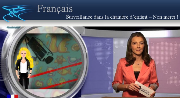 Surveillance dans la chambre d’enfant – non merci ! C'est par cette exclamation cher téléspectateurs que je voudrai vous sensibiliser au fait que les entreprises multinationales comme Google, Goldman Sachs* ou la State Street Corporation** poussent toujours plus loin leurs pions vers leur objectif de contrôle total même en utilisant les chambres d’enfant. En tant que gros actionnaires, elles se trouvent derrière la société Mattel qui a introduit sur le marché en 2015, la poupée « Hello Barbie ». Voilà une poupée aux airs inoffensif, dotée d'un micro et d'un haut-parleur, qui parle gentiment et de manière enjouée, qui raconte toutes sortes de blagues et d’histoires aux enfants. Elle les questionne sur leurs préférences, leurs intérêts et sur leur projet d'avenir, etc.... Les parents peuvent écouter de cette façon les conversations entre l’enfant et son jouet, ce qui est censé leur donner un sentiment de sécurité. Mais le revers sombre de la médaille est-que toutes les conversations sont directement envoyées à l’usine de fabrication et sont enregistrées grâce à une connexion internet via Wifi et Bluethoot. Des parents inquiets et diverses organisations de protection des consommateurs aux Etats-Unis se sont mobilisés contre ces poupées, depuis lors le chiffre de vente a chuté en conséquence. D’une part, cet exemple nous montre la façon sournoise avec laquelle la surveillance totale avance à grand pas. D’autre part, cela confirme qu'une résistance déterminée et une dénonciation peuvent empêcher l’introduction de nouvelles technologie de surveillance. * Banque d’investissement internationale ** Entreprise financière américain